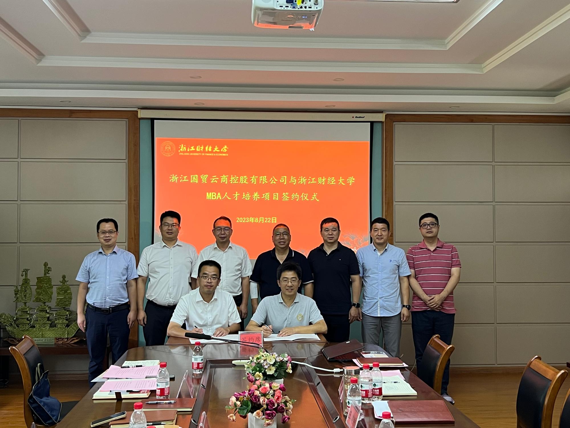 MBA人才培养项目合作签约仪式在5号学院楼410会议室举行。浙江国贸云商控股有限公司党委书记、董事长濮志江,党委副书记、纪委书记鲁霜慧,省国贸集团党委组织部(人力资源部)副部长戴纯平, 国贸云商人力资源部经理丁成山,工商嘟嘟成人网