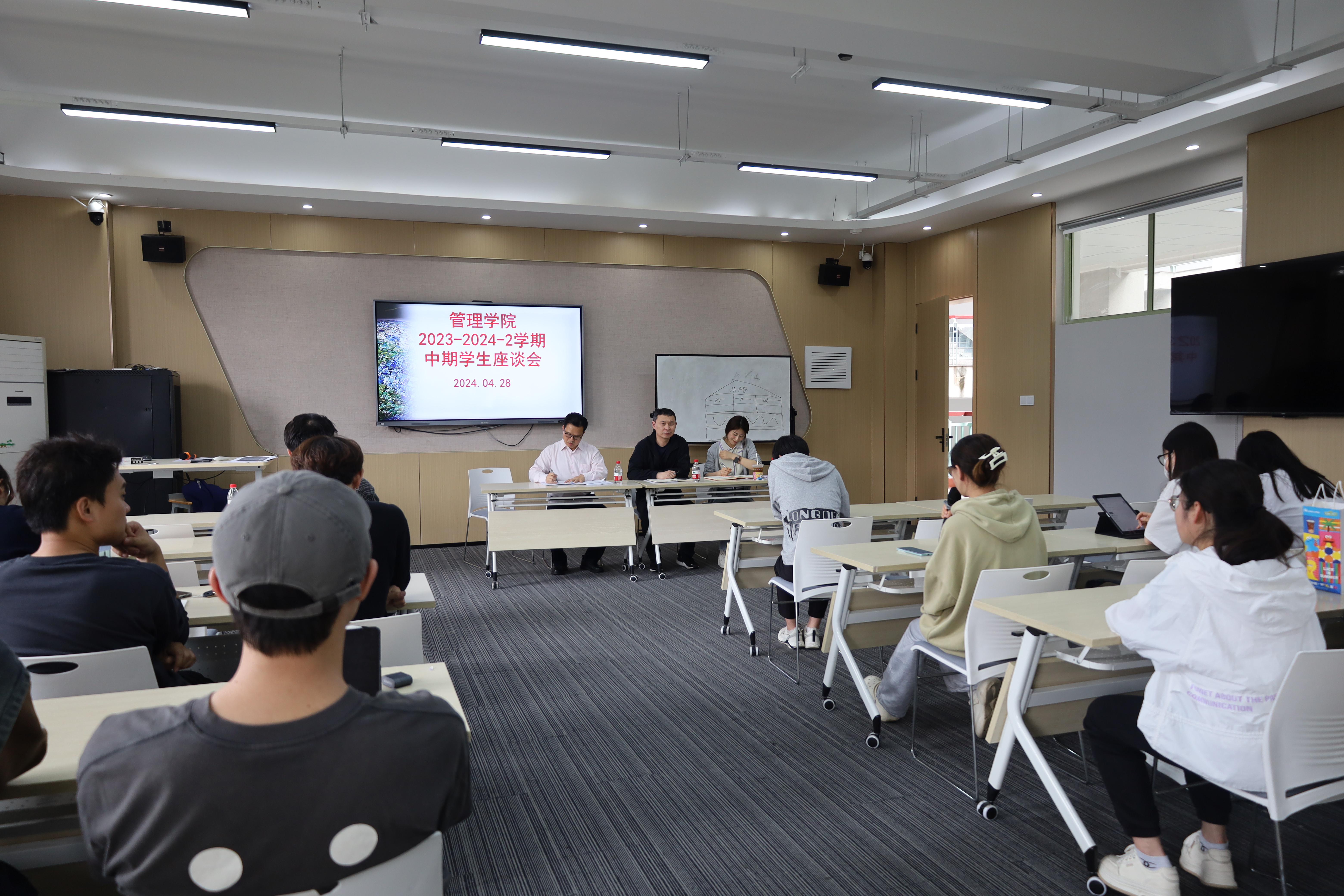 在学院楼411教室顺利召开2023-2024-2学期本科生中期座谈会。座谈会旨在广泛听取学生代表建议,了解教师教学及学生学习情况,打通教学难点堵点,提高学院教学水平,助力学院教风学风不断加强。会议由本科生教学督导组组长郭军灵老师主持。学院副院长张雷、党委副书记陈小芳,督导组成员林与川、高友江、李晓超、孔小磊等老师及21、22、23级各班级学生代表共60余人参加了本次座谈会。