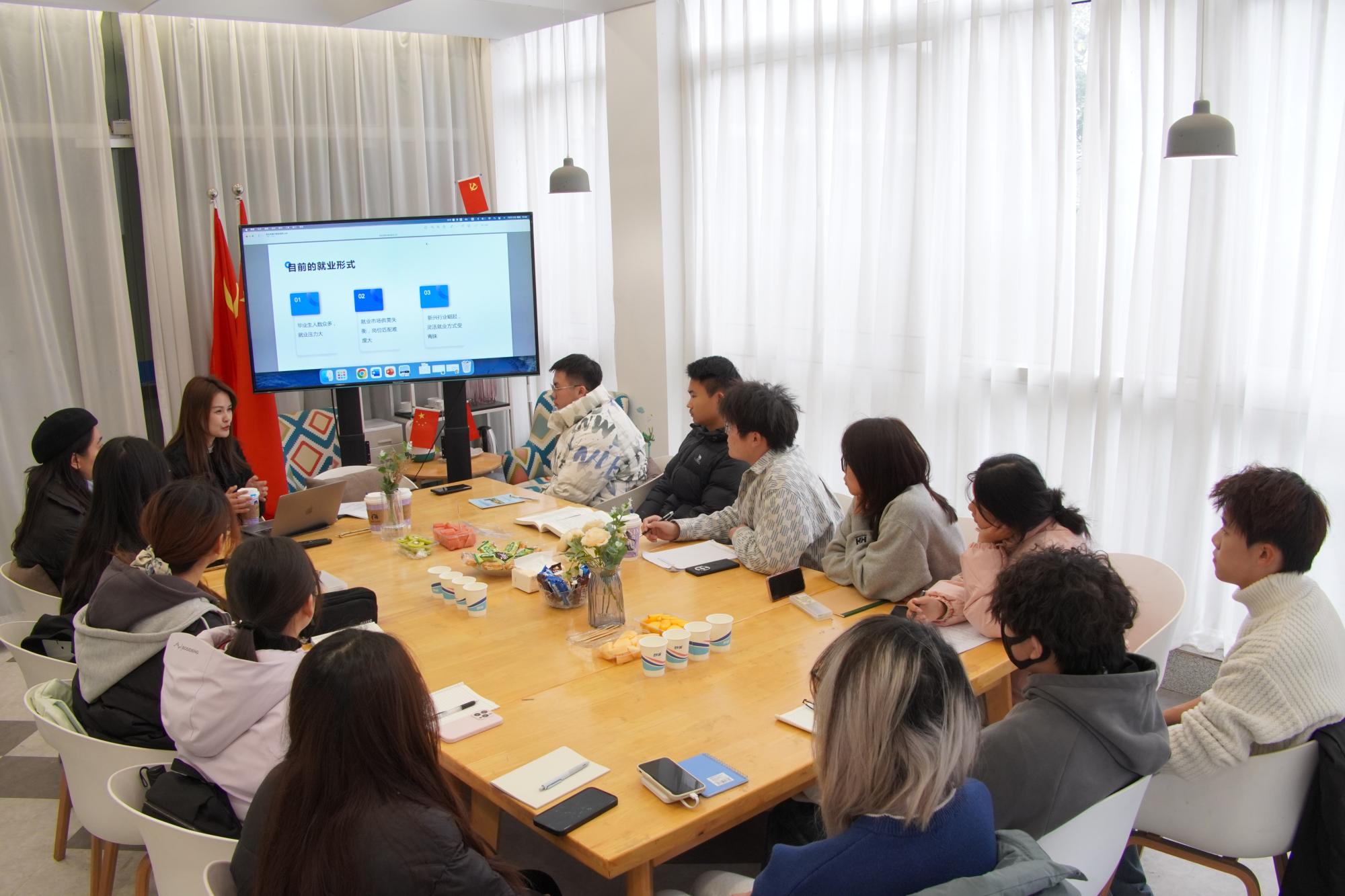 活动中,郑老师通过模拟面试和无领导小组讨论,让学生们在实践中学习和提升。面试环节中,她为学生分享了与简历优化和面试表达相关的经验技巧。同学们以“是否应该支持碎片化阅读”为议题,让学生在具体情境中提升团队协作与思辨能力。