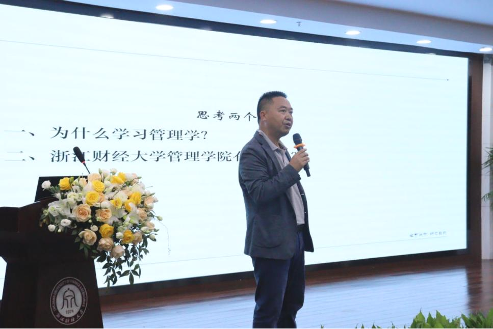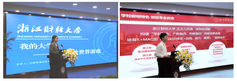 两位毕业于绍兴市高级中学的浙财优秀学子邹睿康与凡沛然作为学生代表,分享了大学生活的成长故事。凡沛然以“开放世界游戏”比喻校园生活向大家展现了校园生活的无限可能。邹睿康则向学弟学妹们展现了三年来他由从青涩新生蜕变为自信的“多面手”的成长经历。