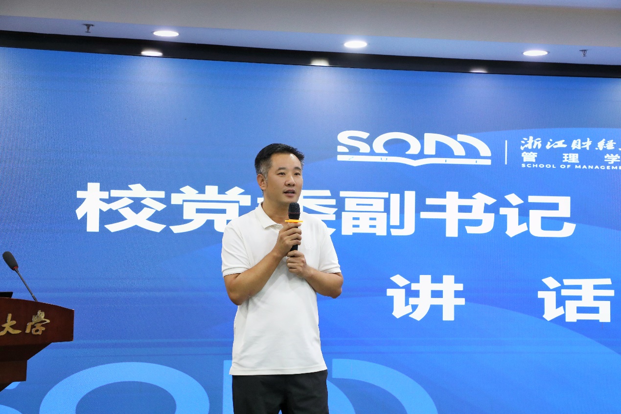 跨学科创新班究竟要培养什么样的人才?校党委副书记程爽以项目辅导员的身份为在场同学作精心解读,他提出“每一位同学都应该把握生产力趋势,做自己人生的‘建设者’”。程书记结合自身在政府政策研究与高校人才培养的双重工作经历,深入剖析到未来企业竞争的核心是“技术+管理”的深度融合,同学们的职业选择必须紧跟生产力发展趋势,才能在时代浪潮中找准方向。他特别对创新班学生提出期待,鼓励大家从被动的“知识接收者”转变为主动的“班级建设者”,以实践需求反向推动课程内容优化,形成“实践-反馈-学习”的良性循环。程书记还分享了优秀校友在科创领域突破的生动案例,以此激励同学们:“相信才能看见,要树立成为科创参与者的长远目标”,并坚定表示,凭借财大扎实的培养体系与同学们的不懈努力,大家完全有能力成长为科创领域的核心力量。