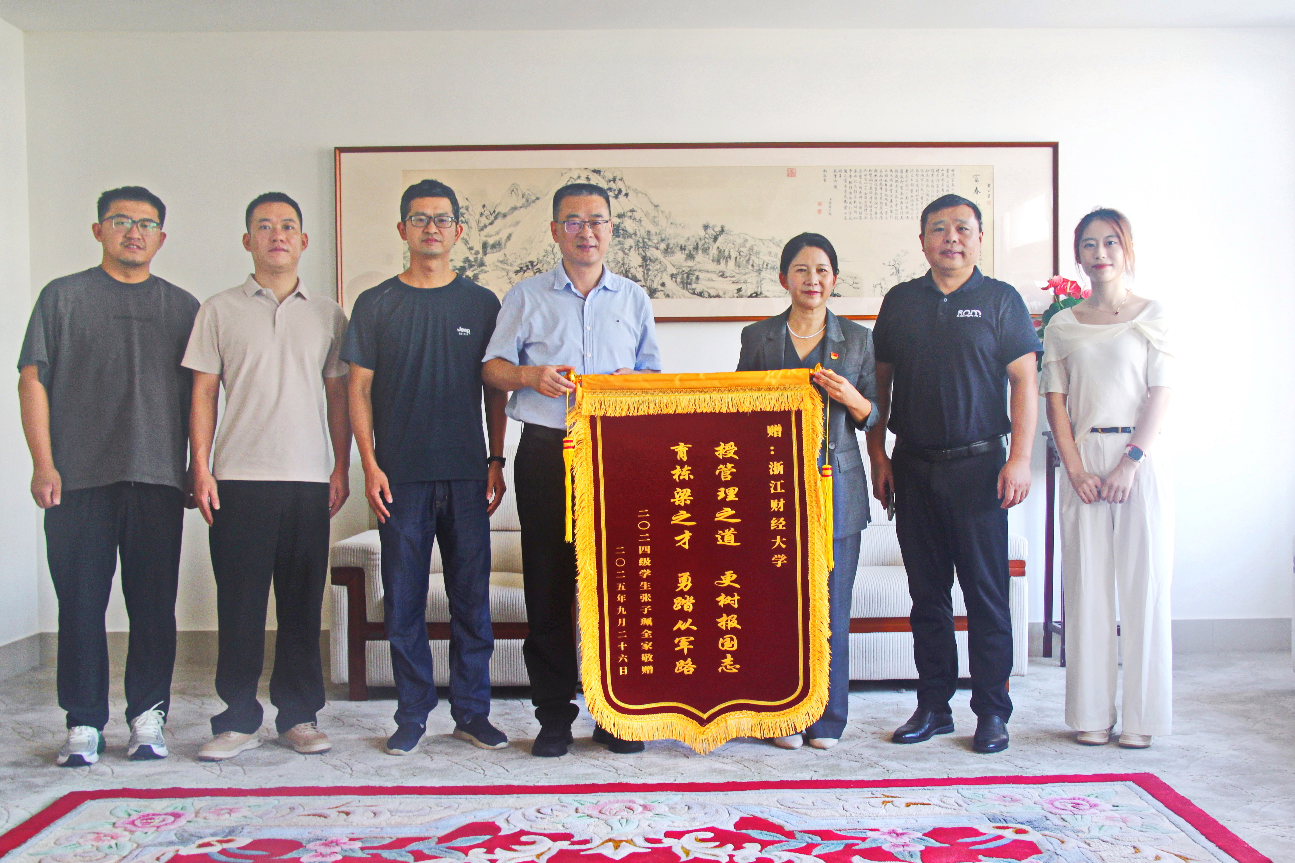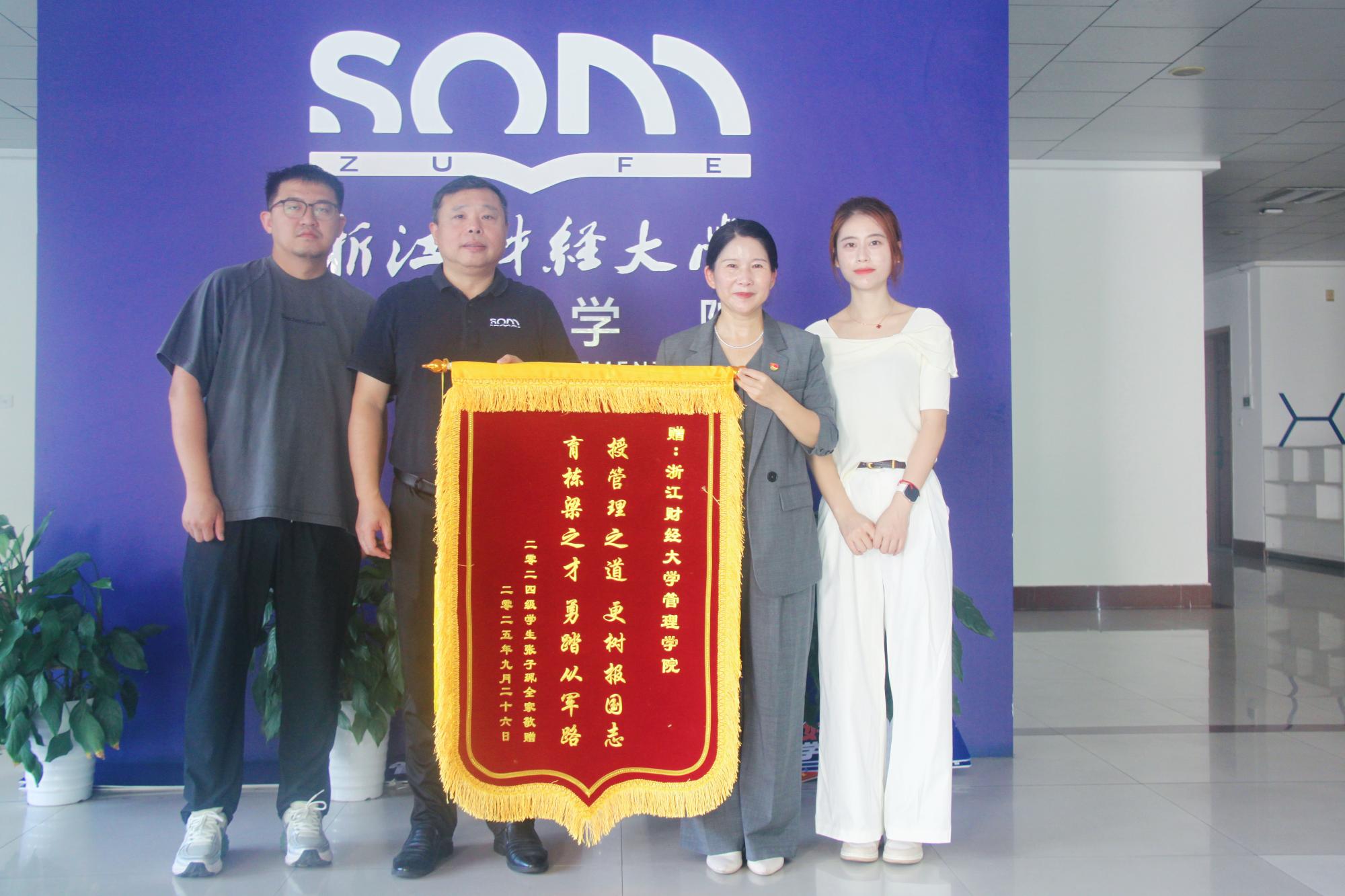 2024级市场营销(中外合作办学)专业学生张子珮的家长王萍女士专程来校赠旗,感谢校院对张子珮的悉心培育与成长引导。此次赠旗,既是家长对学校育人工作的高度认可,更成为家校协同助力学子逐梦国防的生动体现,受到校党委副书记徐晓东的热情接待。