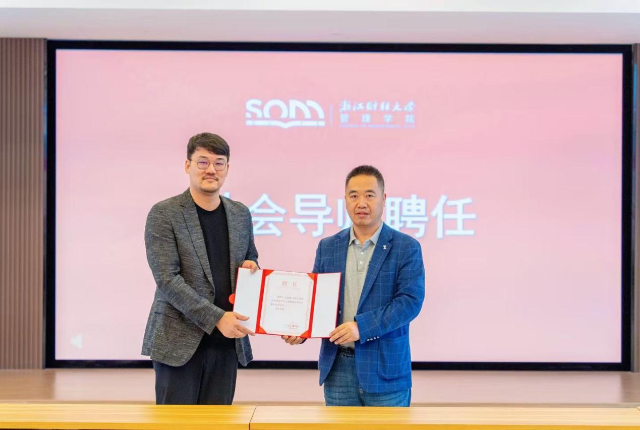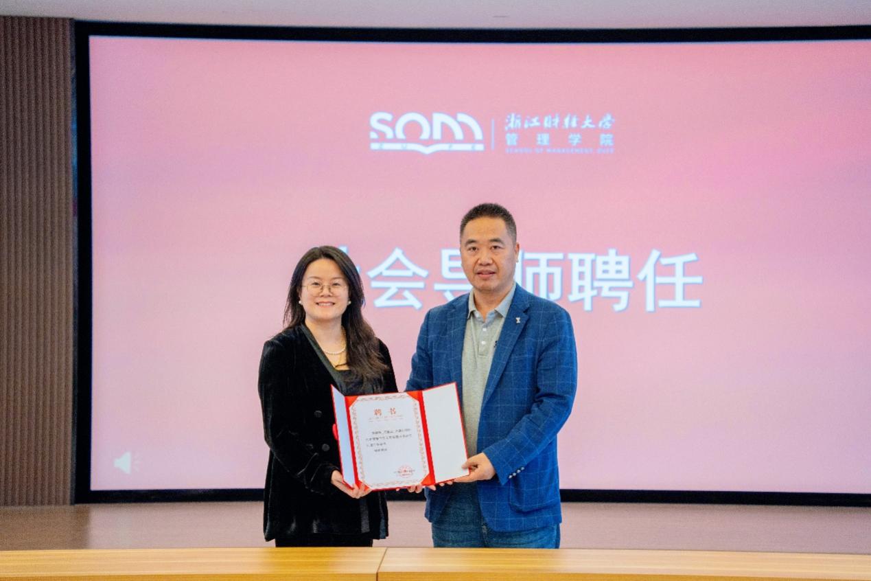 学院院长董直庆为竺俊景董事长、何茹洁总经理颁发跨学科创新班社会导师聘书,并宣布嘟嘟成人网