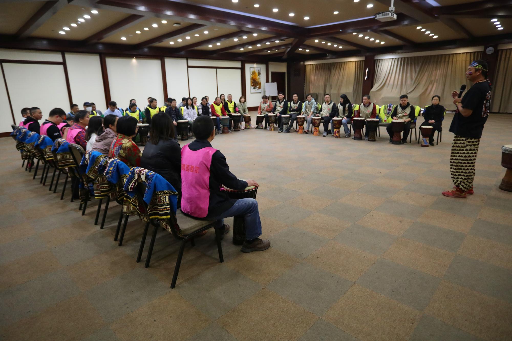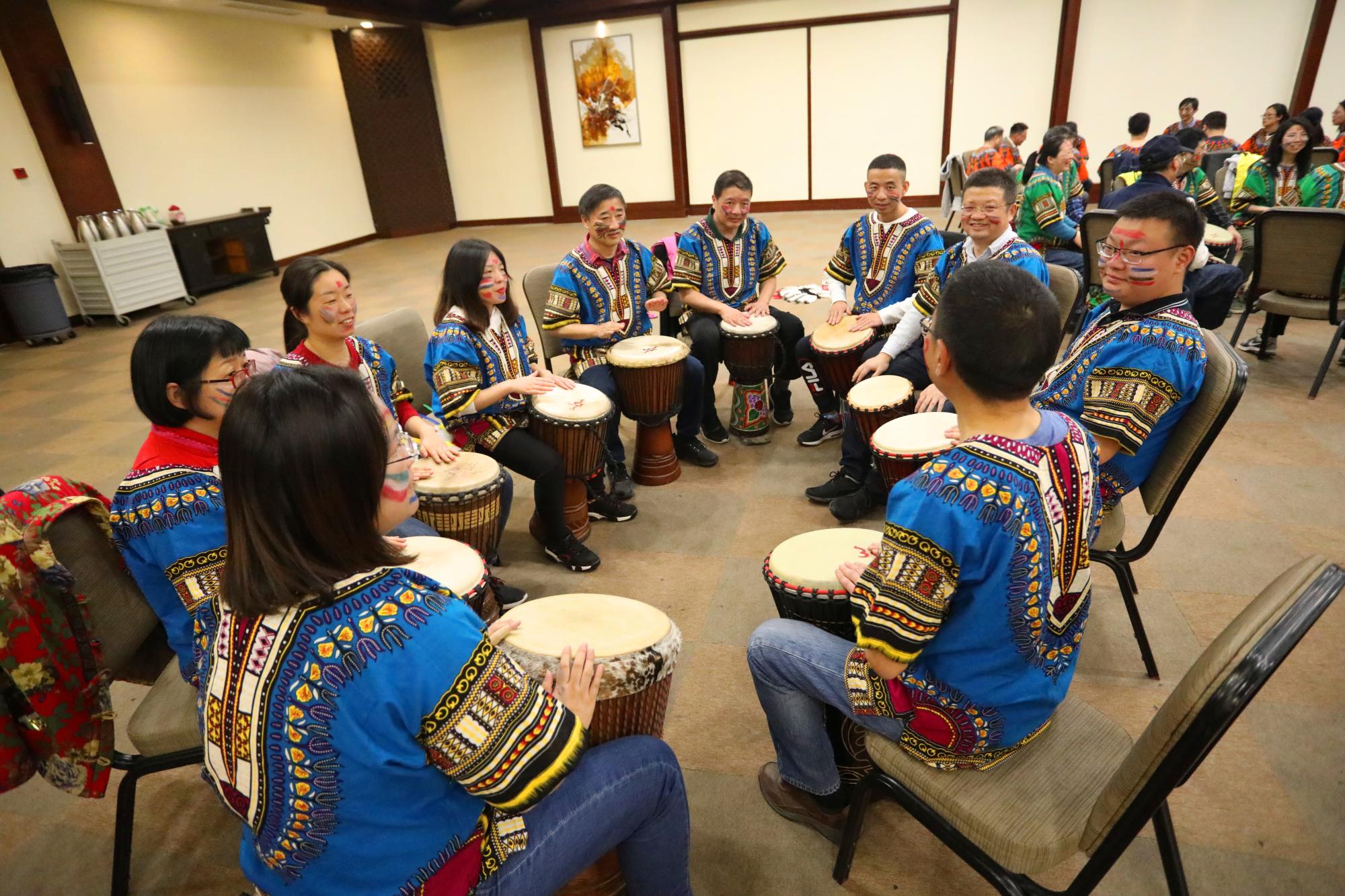 第三个团建项目是非洲鼓团建。非洲鼓起源于西非部落,属于土著民族的传统乐器。通常是挂在脖子上边走边打,而并非放在地上敲打。最特别的是,这乐器一定要用手敲打,一手调整音调的高低,另一手敲出节奏。非洲鼓演主要特色在于其音乐属性可以广泛被运用在特殊节庆场合,所谓“会说话的鼓”。具有自己的民族特色,无论是制鼓的材料、形状和演奏技巧都是独特的。大家通过非洲鼓团建项目,更好地提升的教师们的执行力和领导力,也让团队更加和谐。
