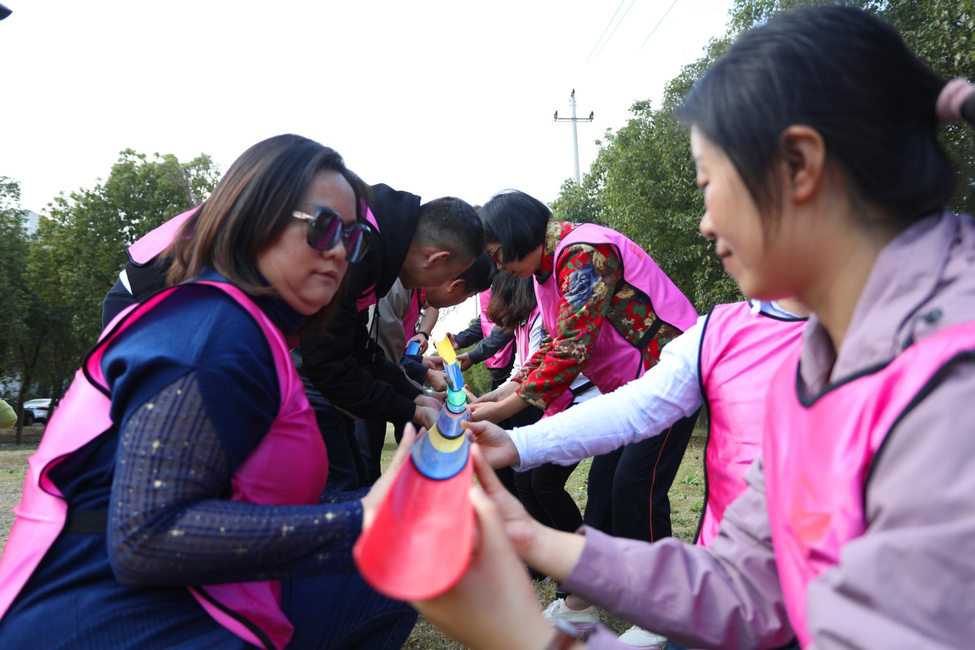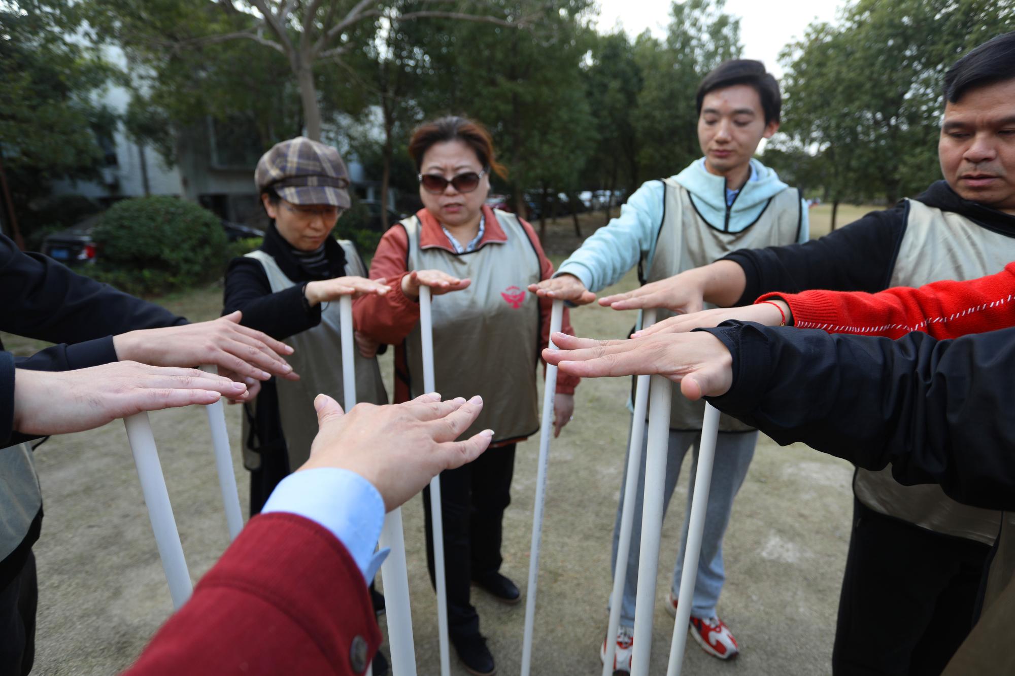 第二个团建项目是挑战NO.1。挑战NO.1是一个以团队为中心的组合竞技项目。教师们分成4个团队,每个团队10-11人。团队通过不断优化和分工,在规定时间内一共完成4个挑战项目。面对一个多环节,多关卡的工作任务时,如果团队协调不好工作的衔接,没有一个很好的大局观,在交换工作环节时无法有效的运用现有资源,不能快捷的,准确的分析眼前的繁琐工作,并没有安排妥善的计划。这是个最好的检验我们工商嘟嘟成人网