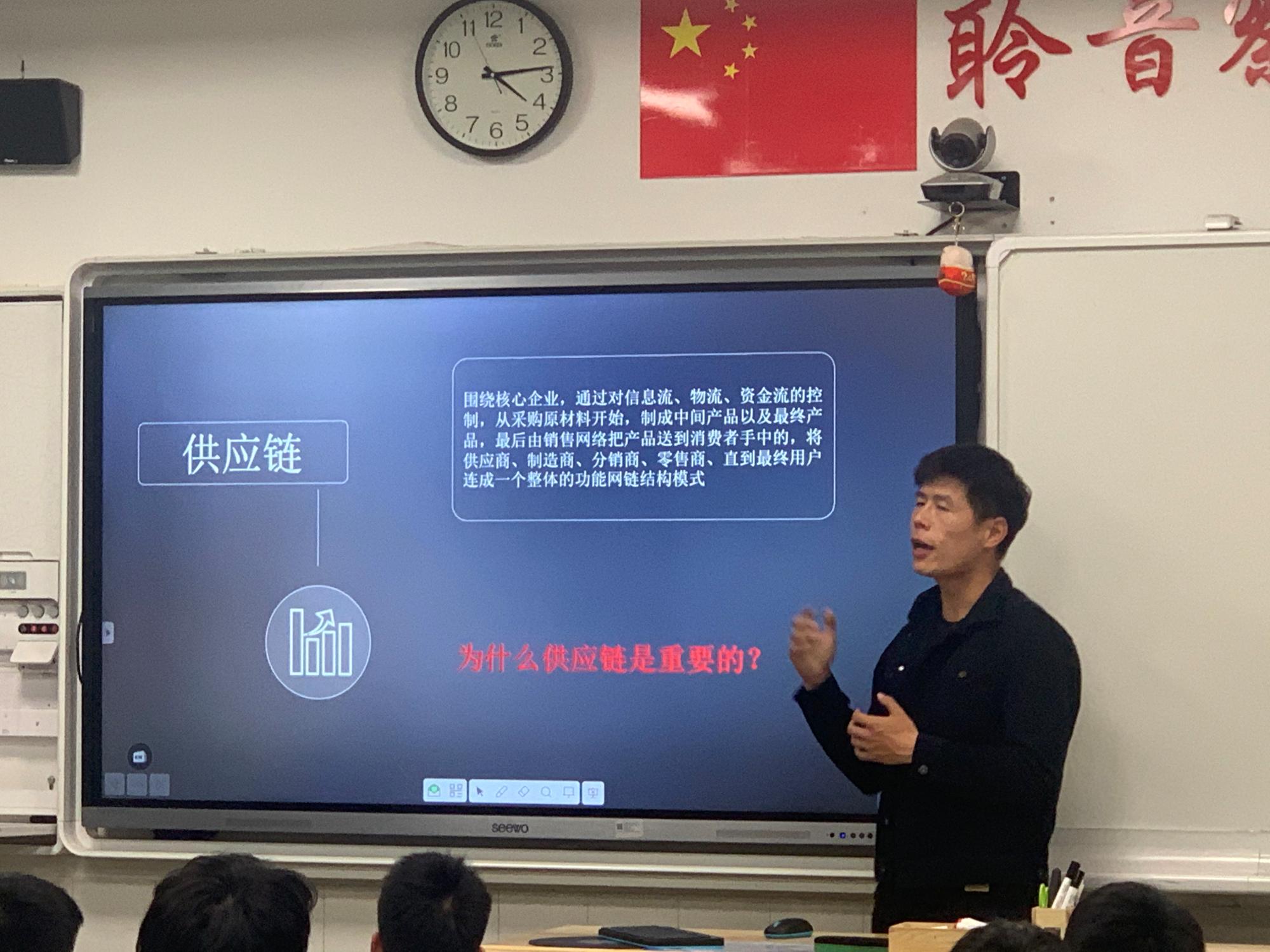讲座过程中,刘竞老师就面向数字化未来的供应链管理,从供应链的介绍、重要性以及进入数字化时代供应链管理的发展等角度展开介绍,从专业层面描绘供应链管理专业的发展前景和未来趋势,帮助源清中学同学们更全面的了解供应链管理专业。