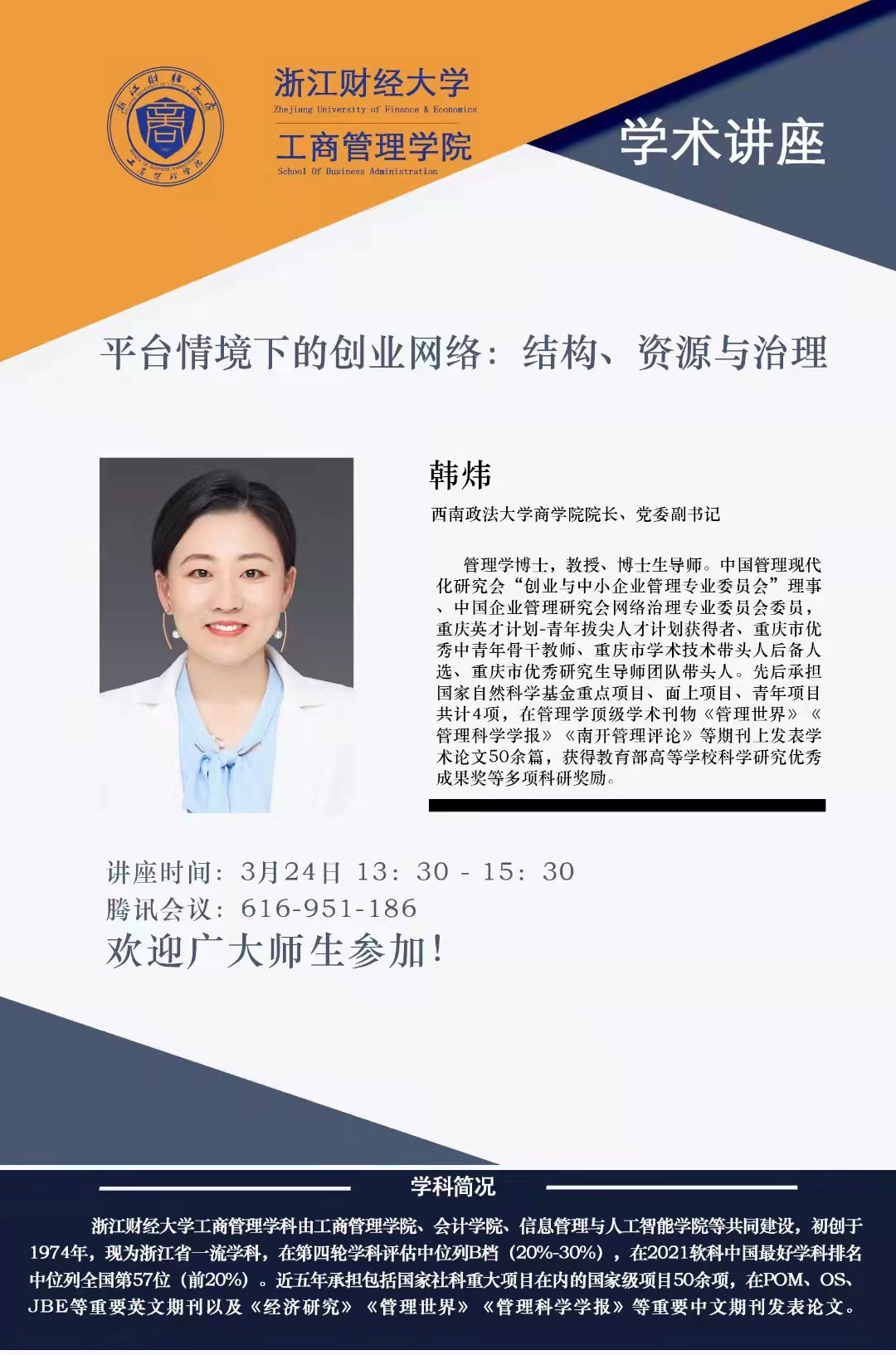邀请西南政法大学商学院院长韩炜教授通过腾讯会议作了题为“平台情境下的创业网络:结构、资源与治理”的精彩报告。来自校内外的六十多位师生和研究人员共同聆听了本次讲座。讲座由副院长戴维奇教授主持。