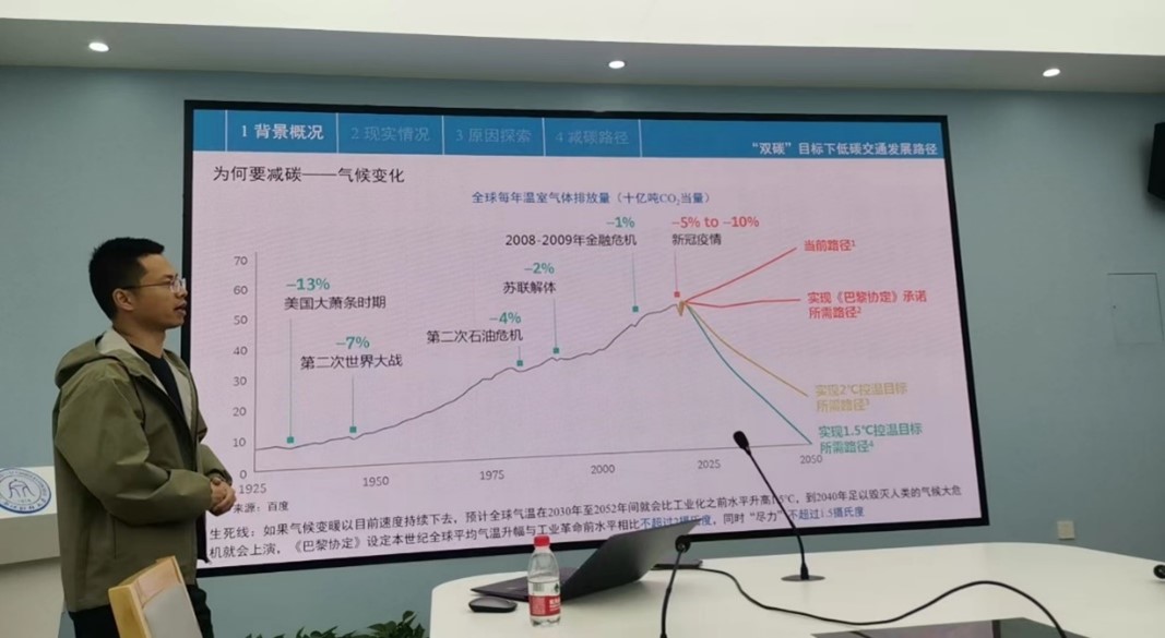 在学术交流环节,周学广老师询问了经济水平是否是影响国家交通碳排放的主要因素,并提出能否在模型中剔除经济因素;丁雯老师也提出国家人口基数会极大影响国家的交通碳排放。随后,诸立超老师针对两位老师的质疑或提问做出回答,并详细解释了发达国家和发展中国家交通碳排放合理性指标的计算及其背后的含义。然后,在场的各位老师针对交通碳排放数据的获取、国际上“碳达峰”,“碳中和”议题的目的和合理性、全球温室效应等方面展开了热烈讨论。