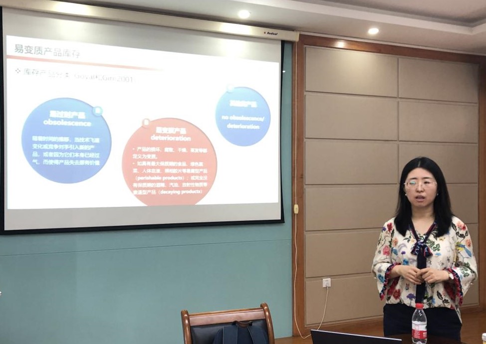 杨亚老师首先介绍了易变质产品的研究进展,并重点围绕一项关于“交叉易腐性影响的生鲜农产品库存优化”研究进行了分享:该研究基于EOQ模型研究了保鲜努力与成本相关且可控的情况下,多种生鲜农产品混合存放时,交叉易腐性对库存决策的影响,及从数据驱动的角度研究最优库存策略的制定。最后,对将要进行的研究工作也进行了汇报:将围绕特殊易变质产品的多个特性,对复杂库存系统及供应链的运作优化问题继续深入分析。