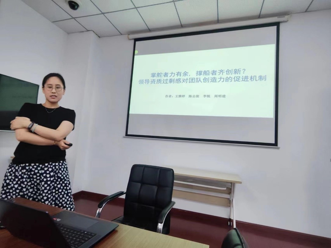 在5-511会议室举办了本学年第七期学术沙龙活动。人力资源系的王雅婷老师作了专题为“掌舵者力有余,撑船者齐创新?领导资质过剩感对团队创造力的促进机制”的学术报告。本次活动由人力资源系主任陈帅老师主持,人力资源系的各位老师出席了本次活动。