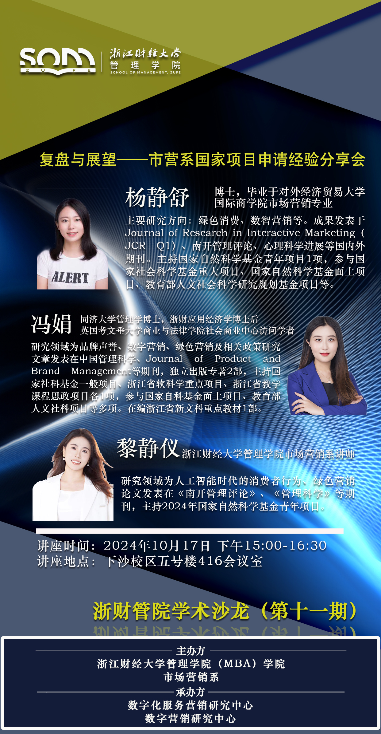在2024年,市场营销系共有三位老师获得国家项目资助,三位老师以此为主题从选题,论述,创新等多个方面对国家级项目申请成功进行了经验分享。