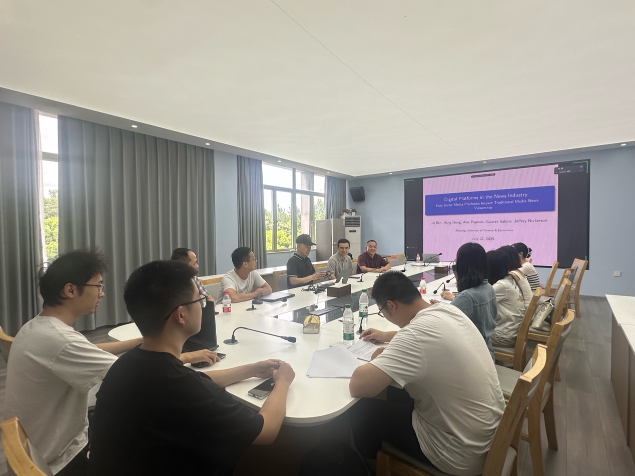 416会议室成功举办。本次讲座邀请了西班牙IE商学院助理教授董航博士,以《从社交媒体到传统媒体:股票市场中的注意力传导机制研究》为题,向在场和线上师生进行了系统分享。讲座由数智技术与管理创新研究所所长杨水清教授主持。