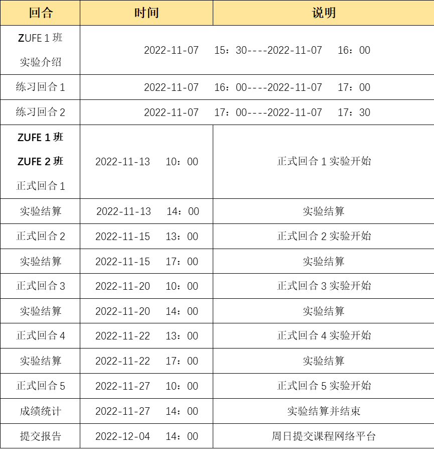 平台将在规定时间正式开放两个练习回合和五个正式回合(请安排好决策时间):
