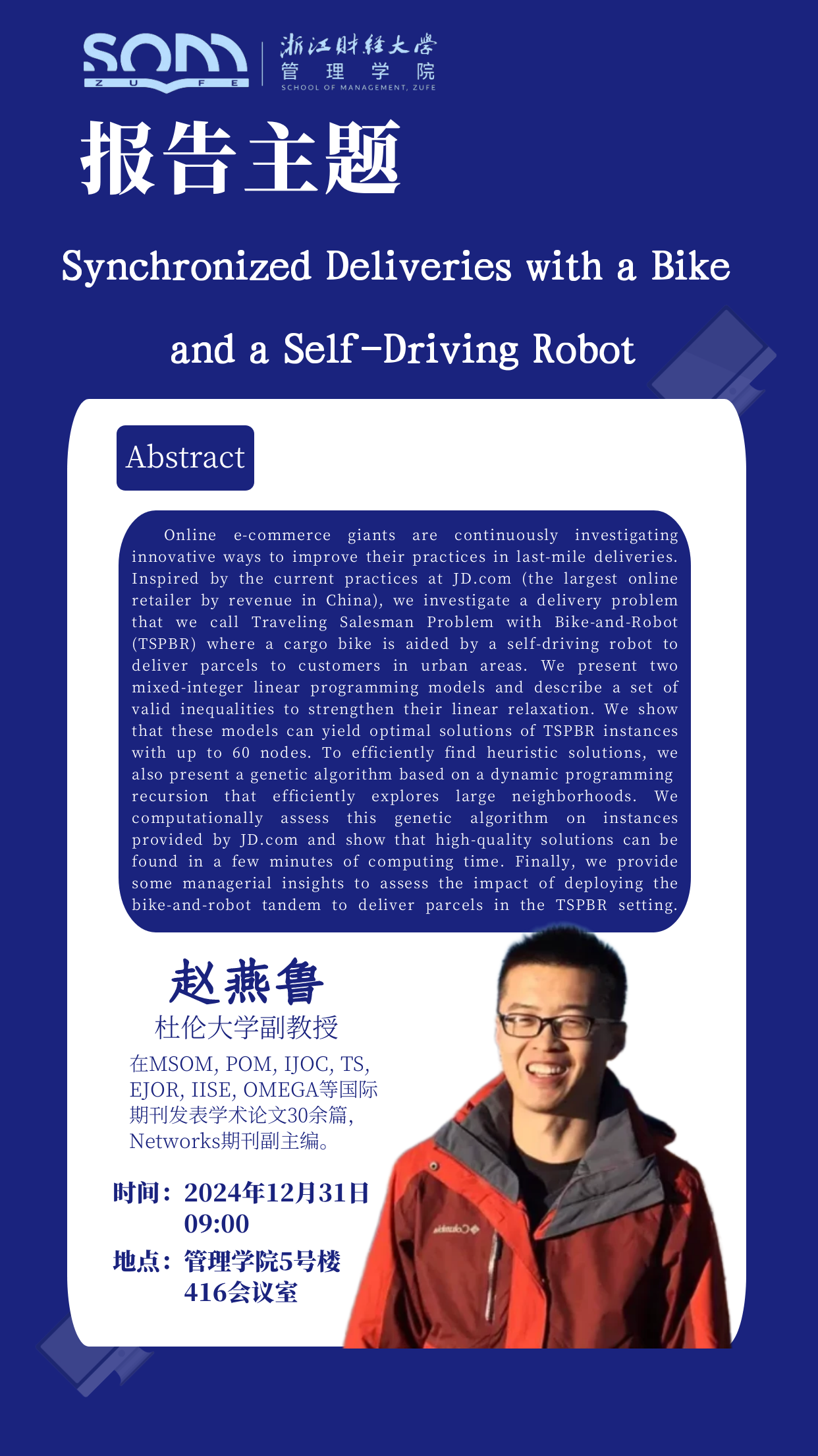 【讲座预告】赵燕鲁:Synchronized Deliveries with a Bike and a Self-Driving Robot