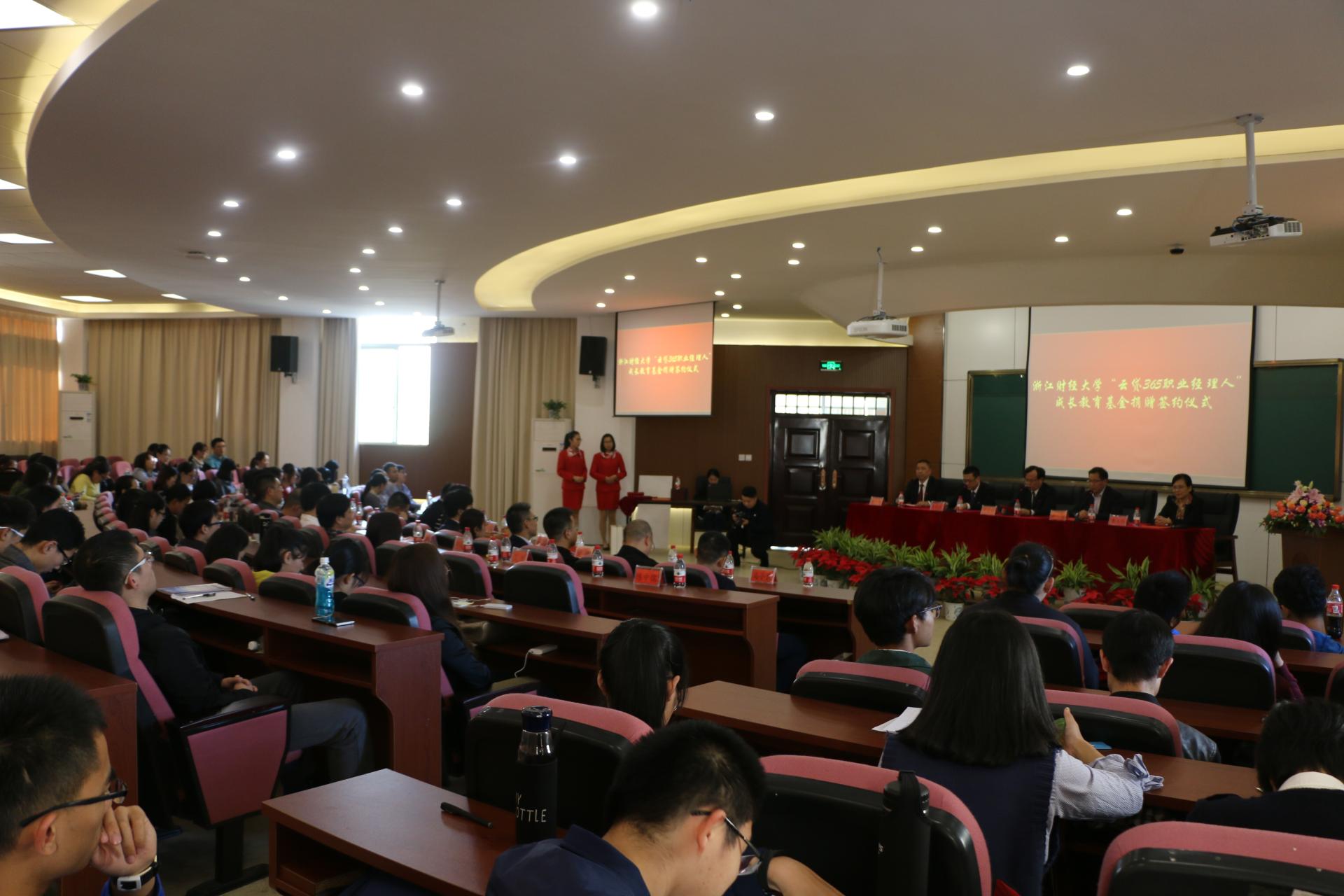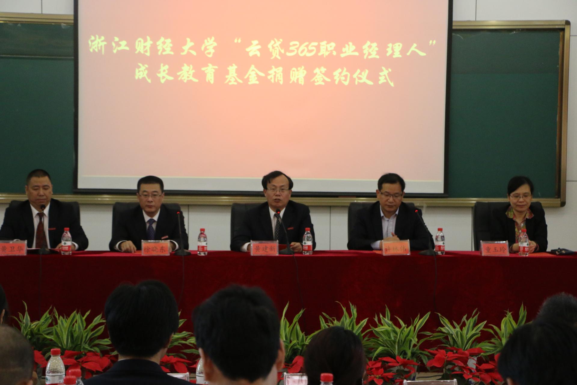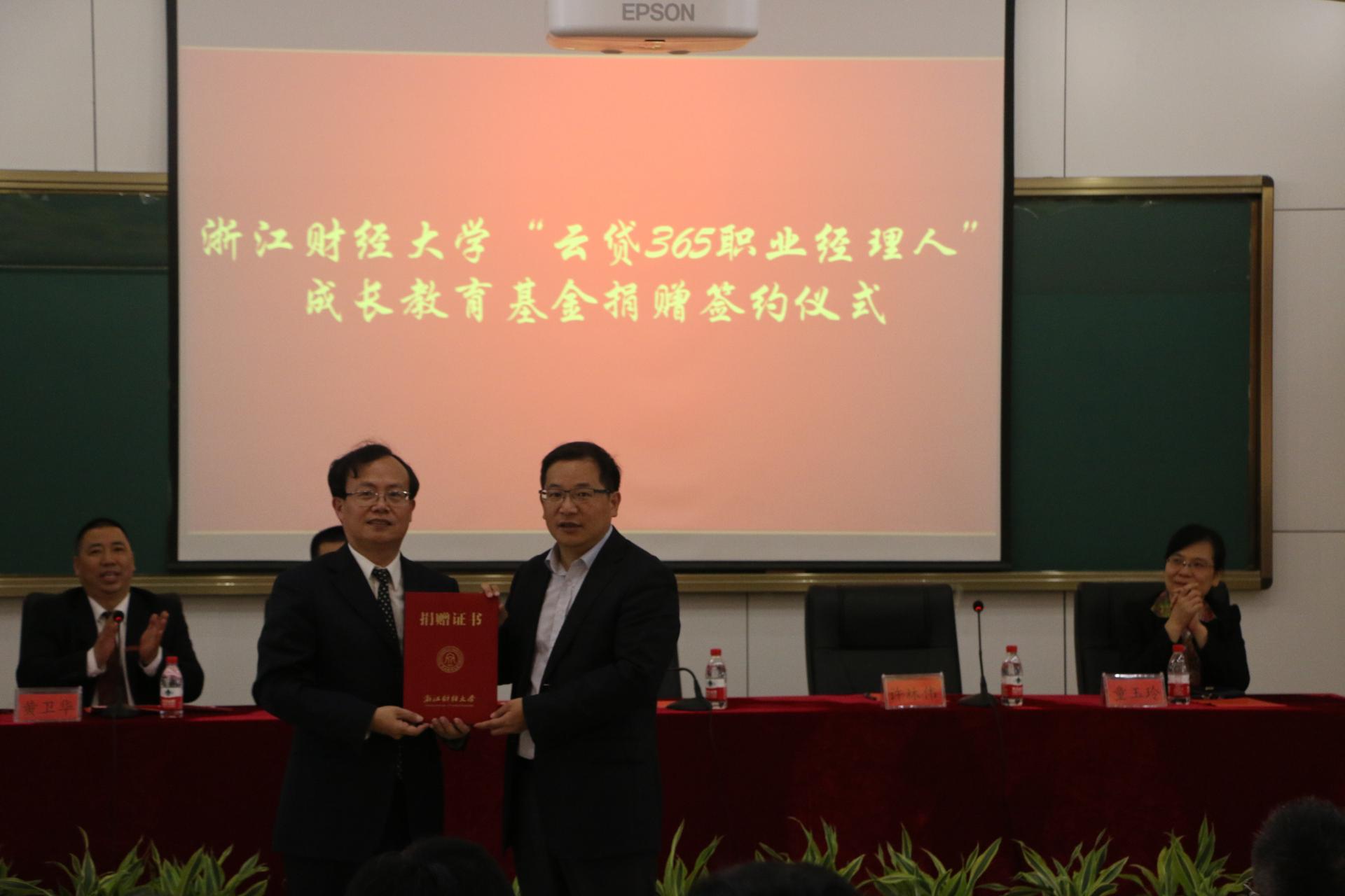 (MBA学院)2010级MBA校友、杭州云算信达数据技术有限公司负责人代表公司向母校捐款100万元,设立云贷365职业经理人成长教育基金。副校长黄建新,校党委委员、宣传部长徐晓东,财务处、研究生院、工商管理(MBA学院)等部门代表,以及校友和在校生代表参加了捐赠仪式。