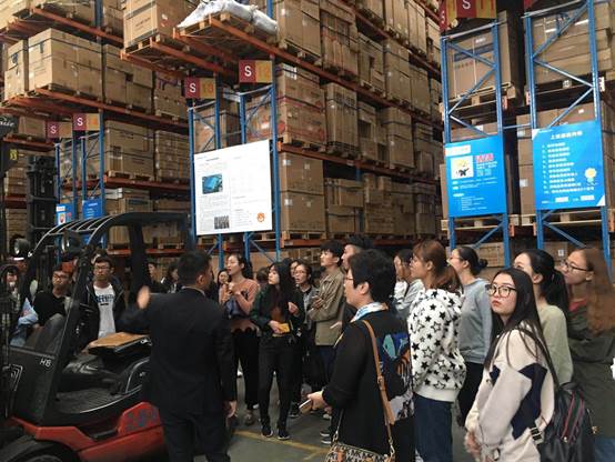 陆总监详细的介绍了苏宁物流配送中心的运营现状,并带领大家参观了物流基地中不同类型的仓库设施,通过各种货架、托盘、夹包机、高位叉车、扫描枪等仓储设备的展示介绍以及现场操作,使同学们更直观深入的了解苏宁配送中心的实际作业情况。特别是物流行业实操中涉及的一些知识,比如单平方利用率1.5,傻瓜式作业模式,还有国标码等等,这些在书本上显得枯燥难理解的专业术语,参观过程中都得以生动的体现,让同学们更易于理解与掌握。