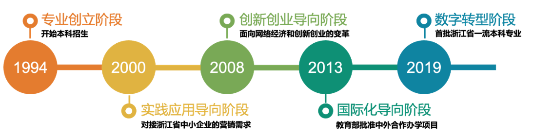市场营销专业创建于1994年,依托工商管理国家一流学科,一级学科硕士学位点、MBA学位点,专业排名全国位列前4.08%,于2020年入选国家一流本科专业建设点。专业建有省级实验示范中心4个,省财政支持实验室1个,教育部产学合作协同育人项目7个,校外实践基地44个。有国家社科基金重大项目首席专家1人,省级人才工程2人,师德先进个人2人,中国高校市场学研究会常务理事2人、理事10人。基于强势学科平台、实践平台和师资队伍,形成了“国际化+大财经+数字化”人才培养优势。面向“互联网+”和国际化浪潮,对接浙江经济社会发展“数字经济、智能制造、互联网金融”等高端产业需求,培养具有国际视野和财经特色的数字型营销人才。