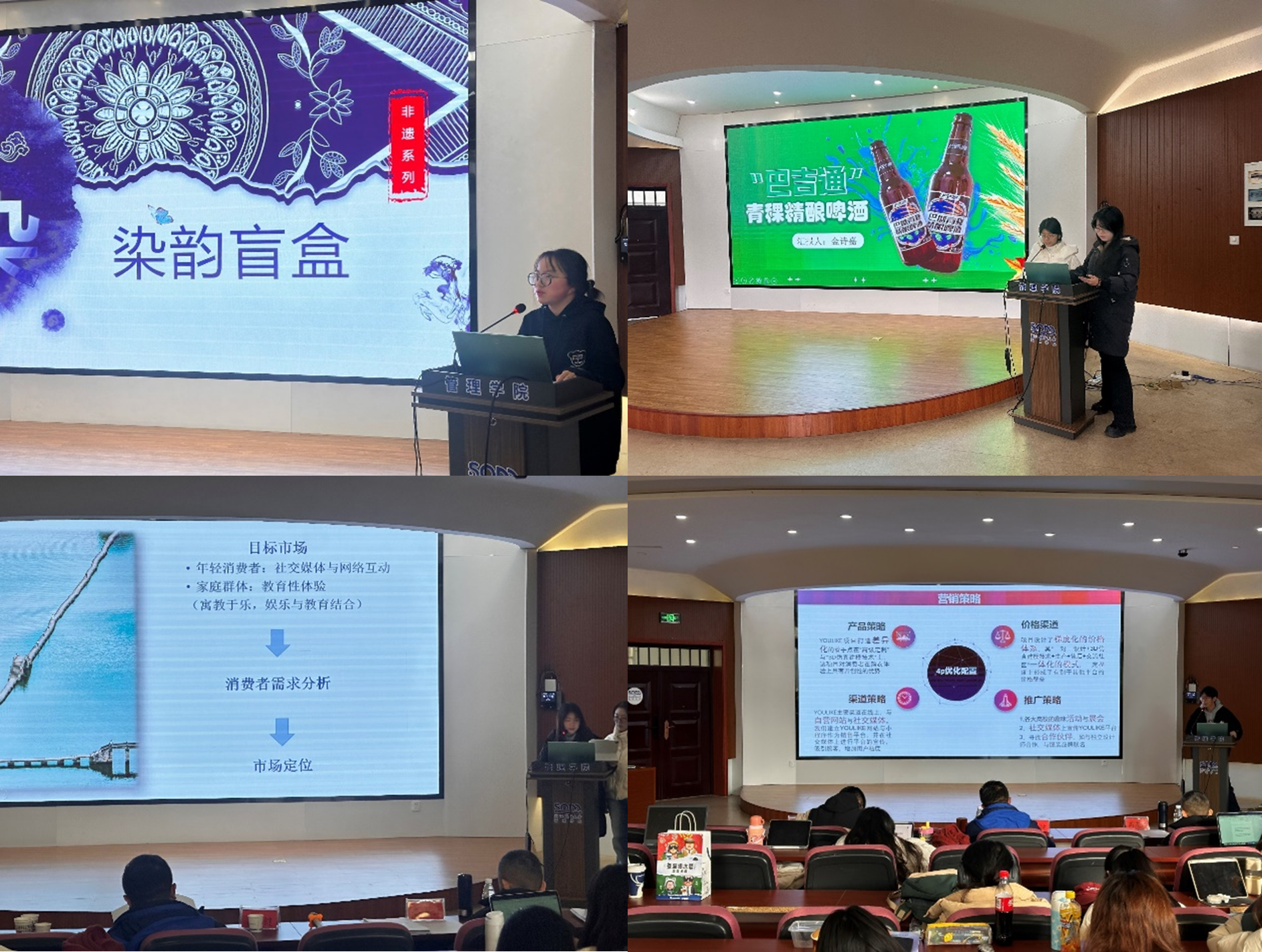 比赛中,各参赛团队依抽签顺序进行PPT项目策划展示,评委老师从策划内容、创意、营销策略及现场表现等5个维度进行点评打分,现场气氛热烈非凡。各小组主讲人条理清晰地阐述项目详情,充分展现团队策划成果与创新思维,积极表达独特见解。评委老师在肯定各参赛队伍策划创意的同时,也精准指出项目优势与不足,为选手提供宝贵经验,也让现场听众对优秀营销策划报告的撰写有了更深刻的认识。