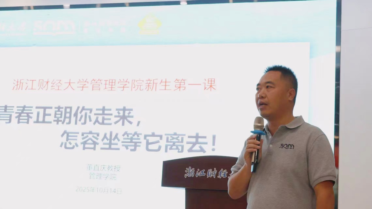 董直庆院长以“青春正朝你走来,怎容坐等它离去”为题,向2025级全体新生抛出“商学十问”,从做人、做事、做学问三个维度启发思考,为新生拨开认知迷雾。董院长着重指出,大学学习与中学存在本质差异,新生需主动打破被动接受的惯性,以独立自发的姿态开启学习新篇。他进一步阐释商学与管理的核心价值,强调这一学科绝非空谈理论,而是要练就解决实际问题的“真本事”与“硬技能”,更要涵养洞察全局的“管理思维”和着眼长远的“战略思维”,是对综合素养的全面淬炼。