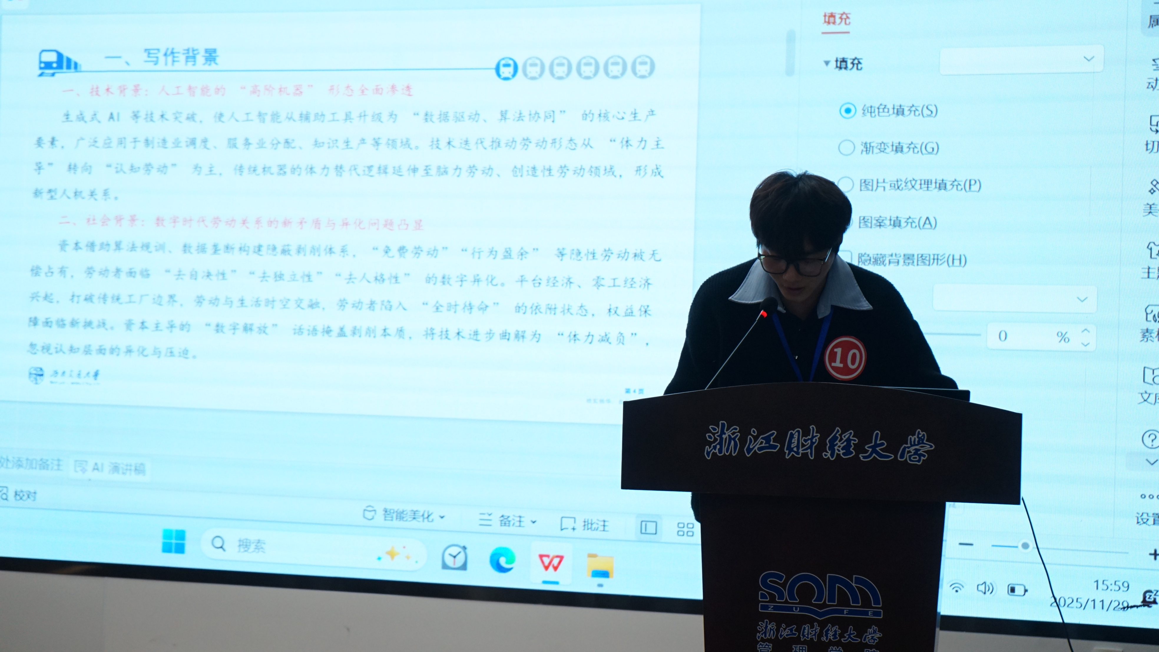 现场汇报中,10位选手围绕企业高质量发展、数字化管理转型、人工智能应用等议题展开深入阐述。评审专家从选题创新性、理论逻辑、研究方法等多维度进行点评与指导,在交流中激发思考,在互动中凝聚共识,充分体现了嘟嘟成人网