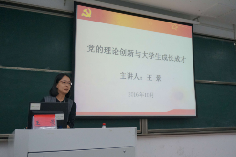第四讲主讲嘉宾是校党委宣传部副部长王景老师。王景老师为大家讲述的主要内容为“党的理论创新与大学生成长成才”,通过介绍九十年来我党在思想理论上的重大创新来展示理论创新对国家、社会发展的重大作用。随后王景老师便向党校学习班的同学们提出了要求:树立梦想,敢于创新,心系祖国和人民,努力提高综合素质,实现自身的全面发展。
