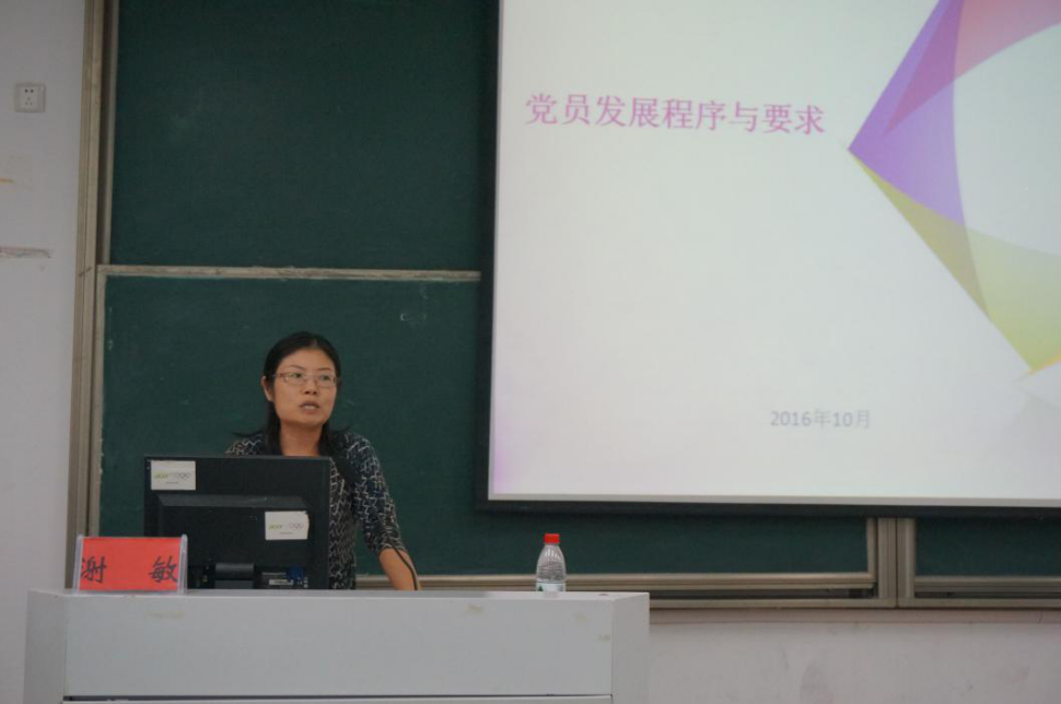 党委副书记谢敏老师主要为大家详细介绍了“党员发展程序与要求”的相关内容,她为我们重点阐述了入党五个步骤中的相关工作与要求。她对现阶段的党员发展程序提出了两个基本观点。党员素质更是决定着组织的未来,所以党员必须要经过严格的选拔。