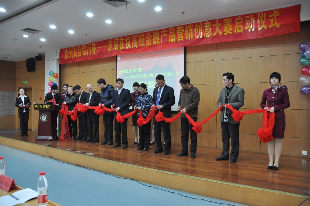 开幕式伊始,伴随着喜庆的音乐和热烈的掌声,校党委副书记王宇航、杭州联合银行总行副行长江志达、校宣传部副部长何建中、校学生处处长沈水法、校团委书记沈鑫泉、浙江工商大学金融学院党委副书记鲍伟、工商嘟嘟成人网