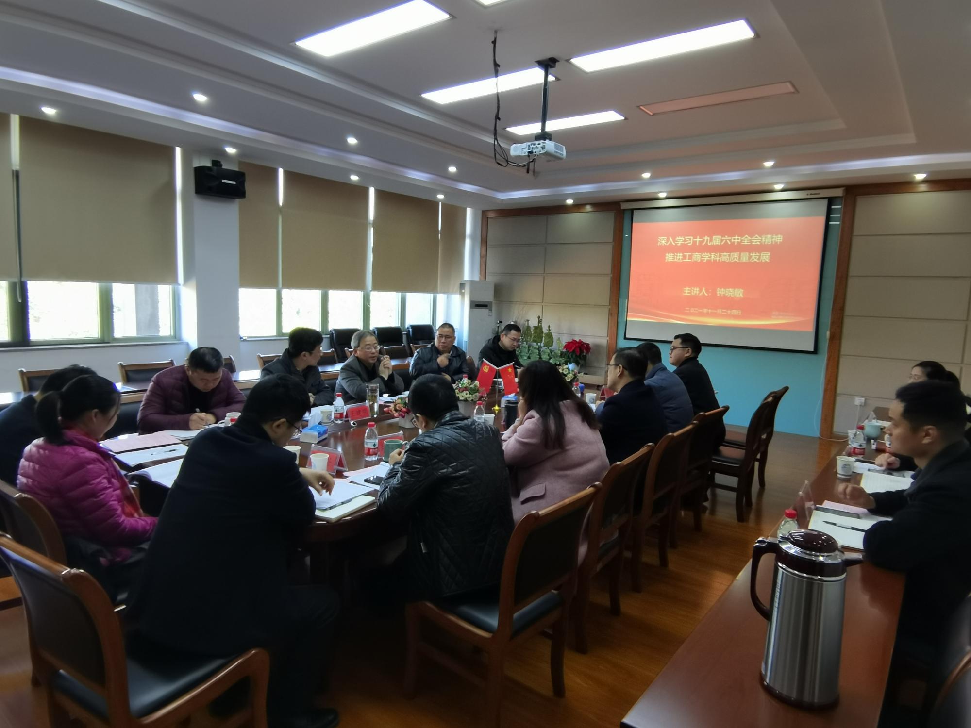 11月24日上午,校长钟晓敏以《深入学习十九届六中全会精神,推进工商学科高质量发展》为题讲授专题党课。会议由工商管理学院党委书记黄卫华主持。
