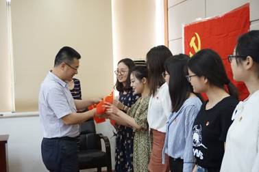 张贴书信毕,即将走出财大校门的陈杭同志代表毕业生党员发言。她表态,学生第四党支部全体毕业生党员定会在日后的工作岗位中牢记财大的校训“进德修业,与时偕行”,用奉献和奋斗为祖国建设贡献自己的一份力量。随后,徐晓东部长为支部毕业生党员授支部党旗,表达了对毕业生党员的祝福。