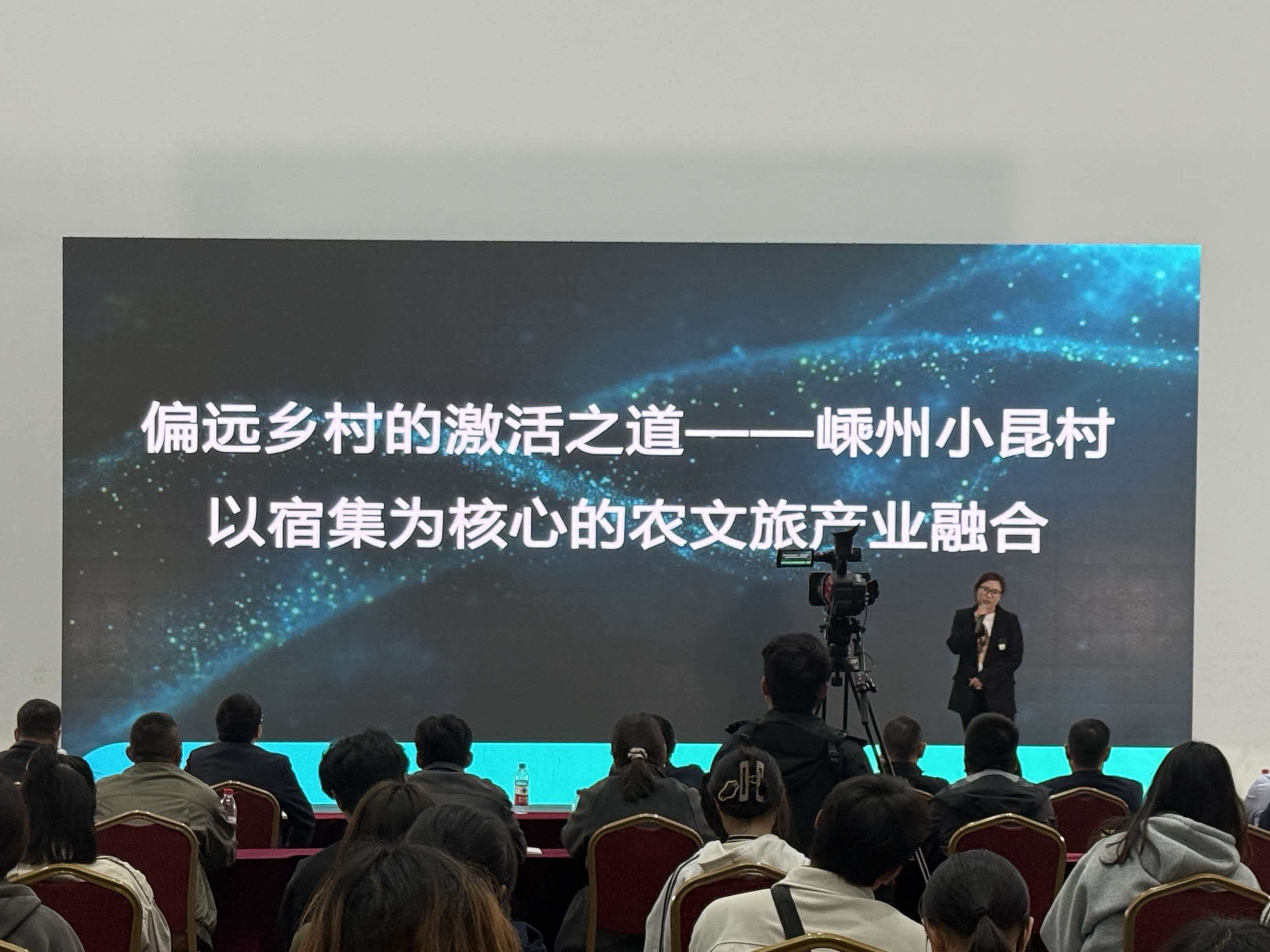 主旨分享环节干货满满。浙江工商大学文化和旅游创新发展研究院院长易开刚以《乡村农文旅创业:从情怀到行动的实践逻辑》为题,从行业趋势、资源整合、落地路径等维度展开深度解析,为青年农创者答疑解惑、指明方向。随后,杭州钱塘区江东村乡村CEO叶翔鹤、绍兴嵊州市小昆村乡村CEO徐骆薇、杭州市萧山区农创客联合会秘书长莫元波分享了各自扎根乡村的创业故事,用“从0到1”的实干经历、直面挑战的成长感悟,传递出农创客群体的责任与担当,引发在场学子强烈共鸣。最后,浙江萧山农商银行河庄支行副行长楼泽炜向同学们介绍了大学生创业贷款及贴息政策。
