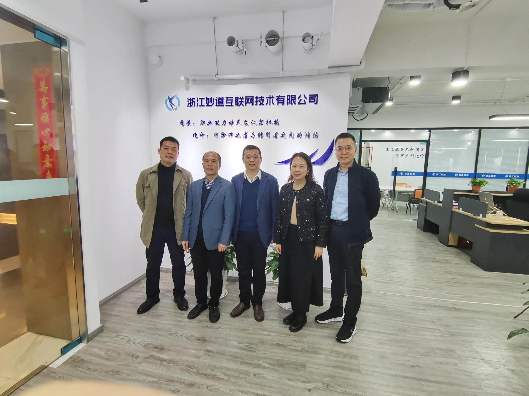 3月17日上午,学院党委副书记吴玻,教工第三党支部书记洪雁,党委组织员、校友办主任杨文超,一行三人到浙江妙道互联网技术有限公司参观交流,受到北京鹏燊国际科技有限公司总经理刘鹏、浙江妙道互联网技术有限公司总经理丁志明等人的热烈欢迎。