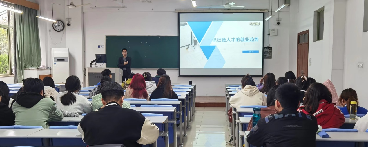 2012届物流管理专业毕业生,现为杭州冠程企业管理咨询有限公司合伙人钟振波作为主讲人,与同学们分享供应链人才的就业趋势。22级工商六班和20级物流管理两个班的同学参与了本次讲座。