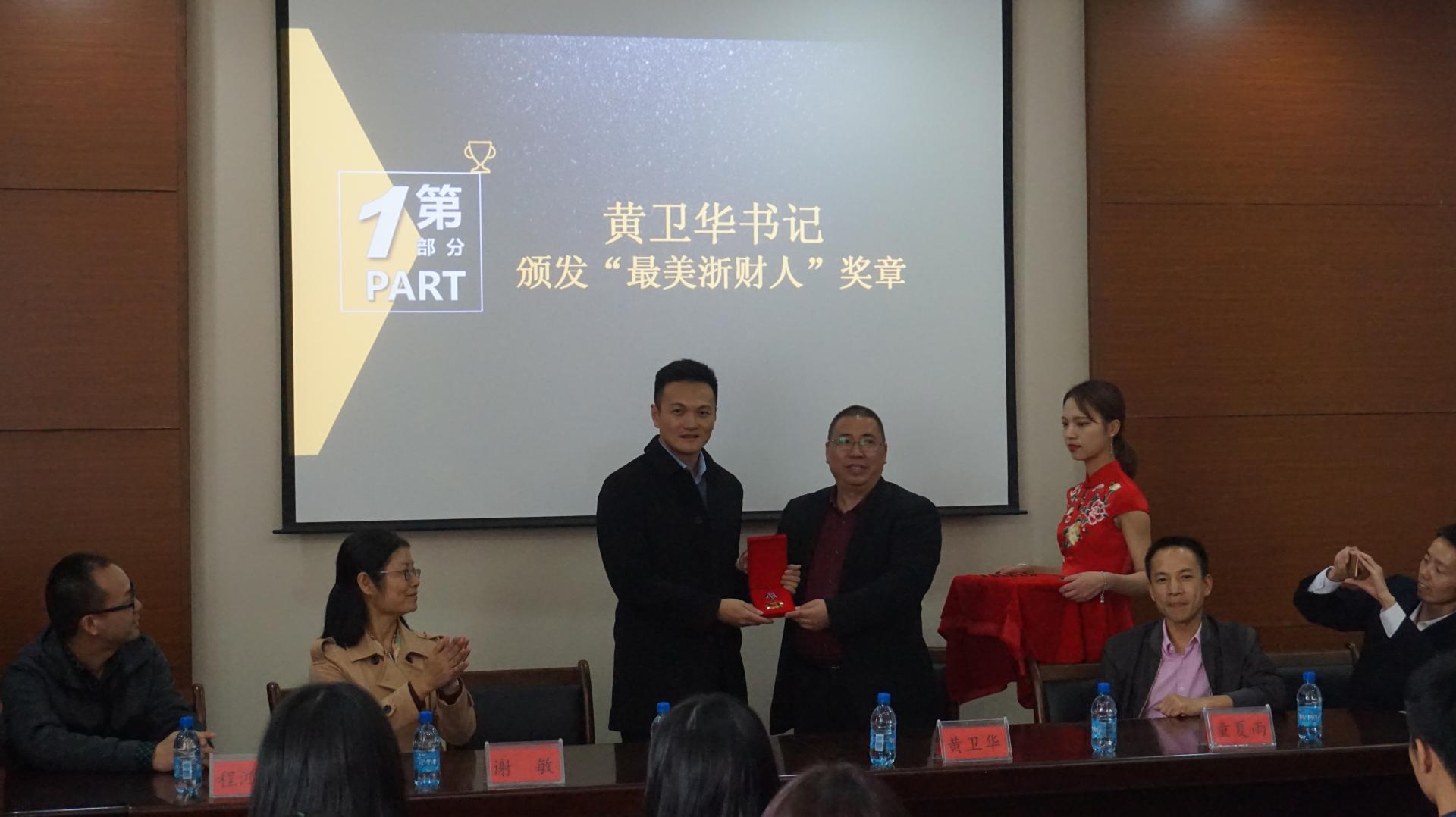 授予了“最美浙财人”的称号。在交流会开始前,学院党委书记黄卫华老师为他颁发了奖章,学院党委副书记谢敏老师为他再次佩戴校徽,这让每一位校友都感觉到了浓浓的母校情。