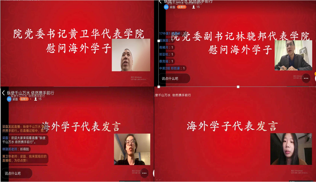 首先,学院党委书记黄卫华代表学院向海外学子表示慰问。黄老师向同学们送上了诚挚的关心与问候,对同学们表达了殷切希望和嘱托,建议同学们做好自身防护、注意人身安全、保持和老师良好沟通。