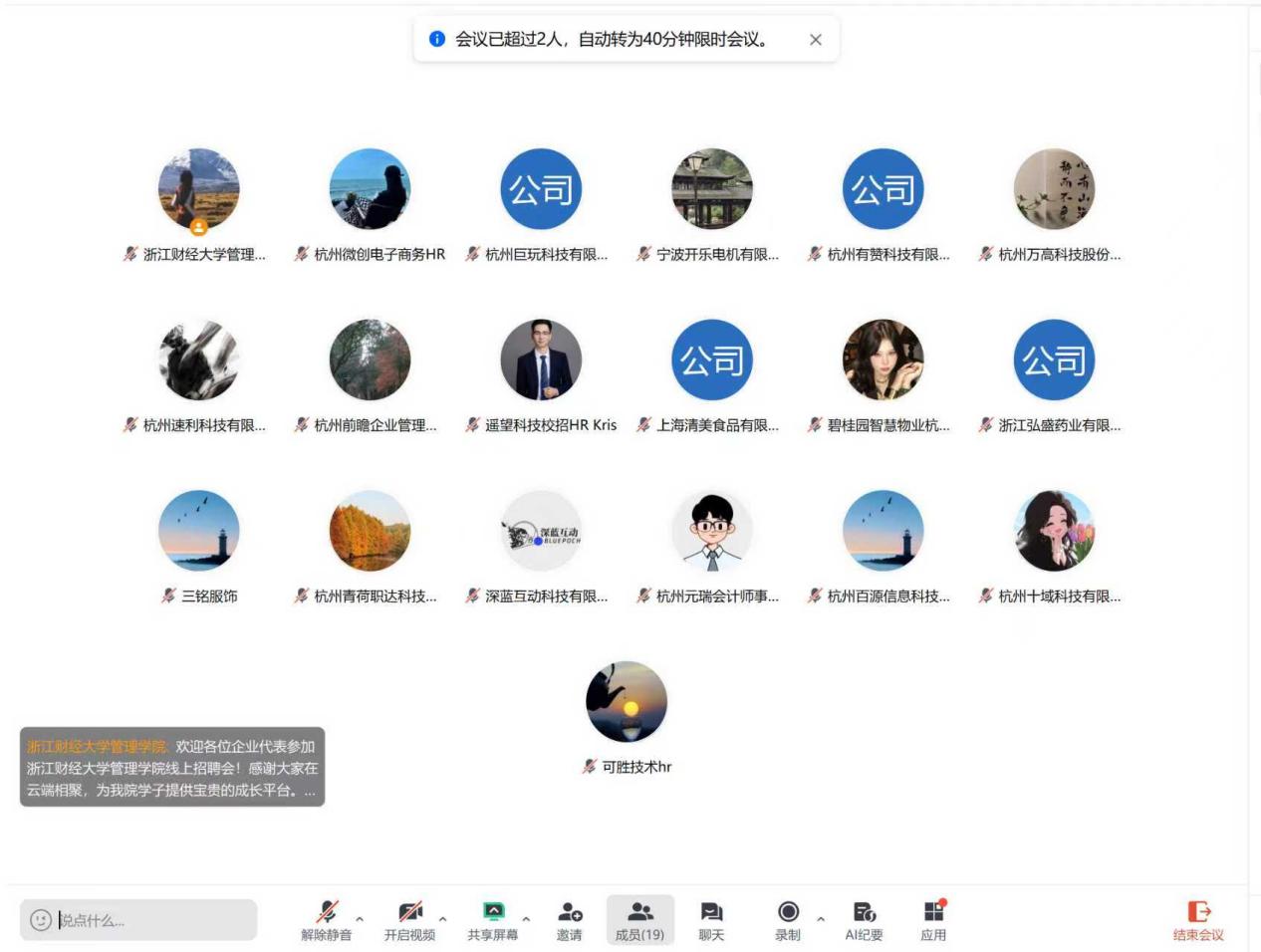 成功举办线上招聘会,杭州微创电子商务、杭州巨玩科技有限公司、宁波开乐电机有限公司、杭州有赞科技有限公司等19家公司代表参与了本次线上宣讲及招聘对接活动。