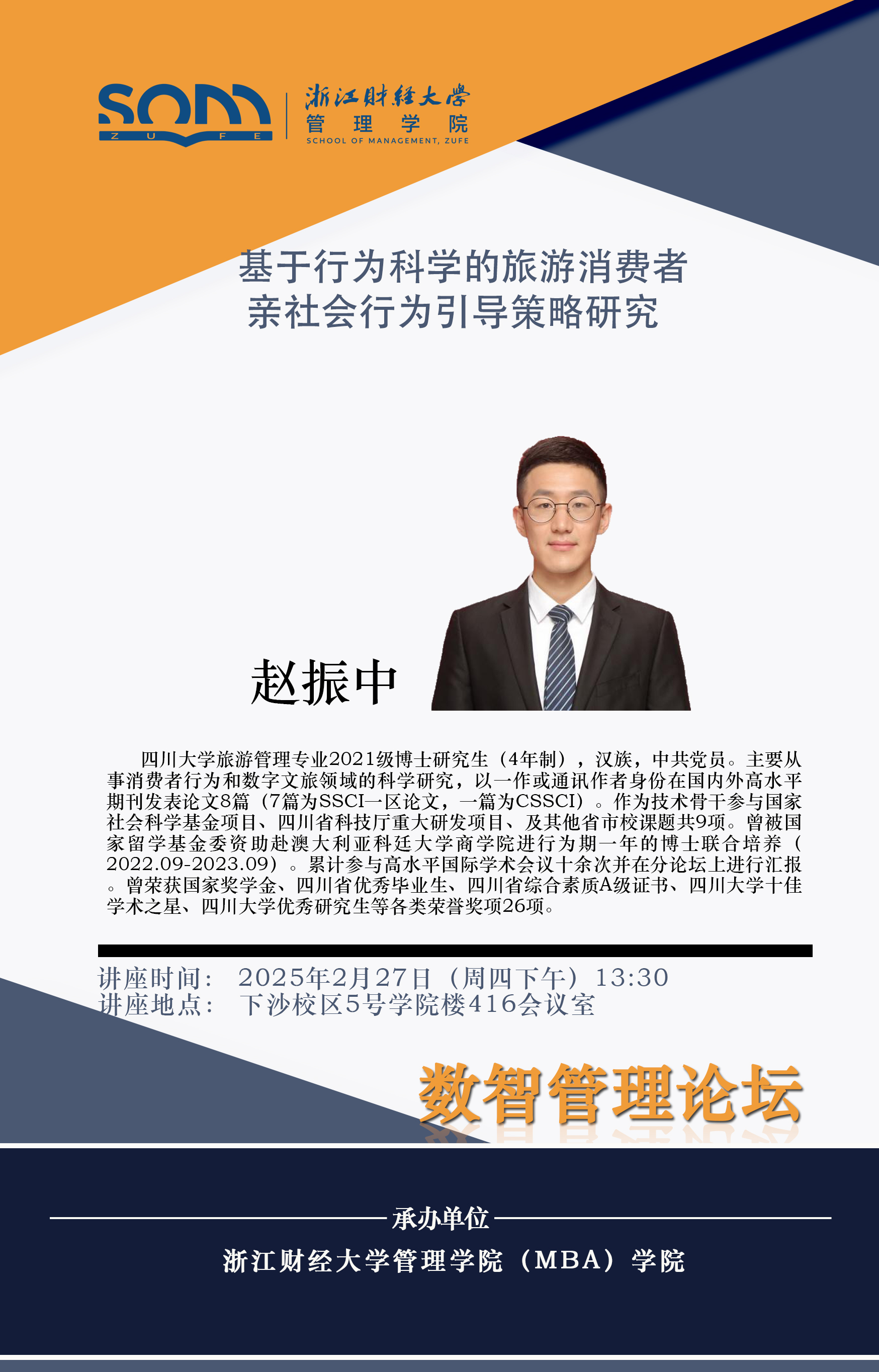 赵振中,四川大学旅游管理专业2021级博士研究生(4年制),汉族,中共党员。主要从事消费者行为和数字文旅领域的科学研究,以一作或通讯作者身份在国内外高水平期刊发表论文8篇(7篇为SSCI一区论文,一篇为CSSCI)。作为技术骨干参与国家社会科学基金项目、四川省科技厅重大研发项目、及其他省市校课题共9项。曾被国家留学基金委资助赴澳大利亚科廷大学商学院进行为期一年的博士联合培养(2022.09-2023.09)。累计参与高水平国际学术会议十余次并在分论坛上进行汇报。曾荣获国家奖学金、四川省优秀毕业生、四川省综合素质A级证书、四川大学十佳学术之星、四川大学优秀研究生等各类荣誉奖项26项。