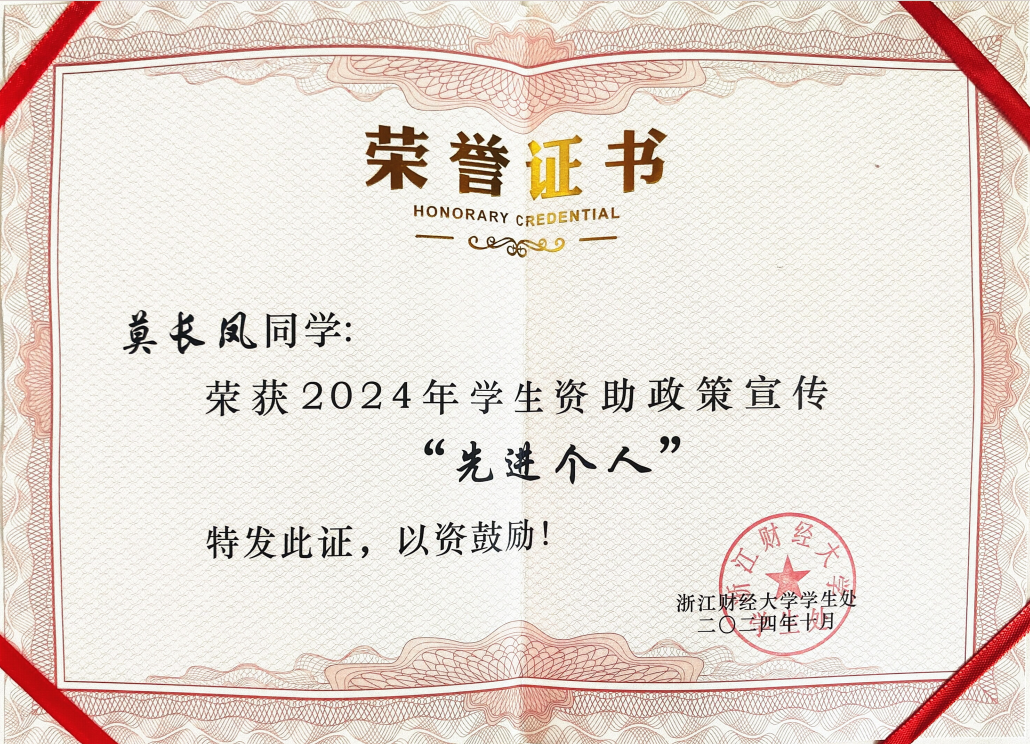 莫长凤同学成功获得浙江省“勤工助学之星”推荐学习个人。