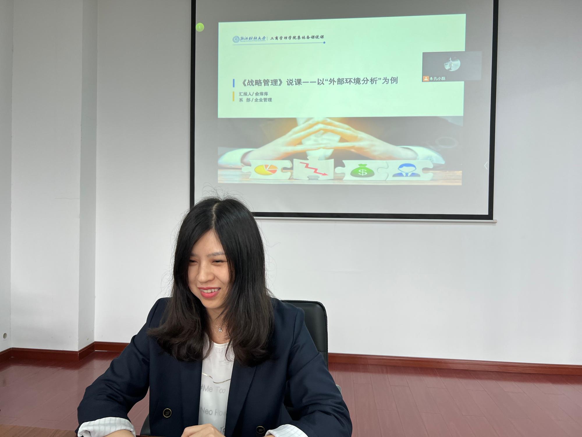 俞萍萍老师以“外部环境分析”这一章节为例,基于“以学生为中心”的教学理念,从教学目标、教学方法和策略、教学过程设计等方面进行了说课。和大家分享了如何通过问题(或现实情境)驱动、综合大案例串联和学生团队互学等方法,引导学生主动思考和积极讨论,并代入战略家角色进行分析和决策,帮助学生构建理论知识,培养战略分析能力,形成战略思维。