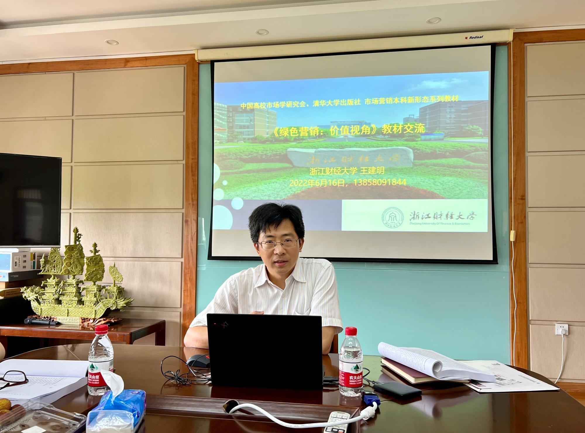 教材主编王建明院长首先从教材编撰的初心、背景开始,介绍了教材编撰的心路历程。而后,整体上介绍了教材体系、教材构成、教材特色、教材应用前景。王院长重点强调本教材是一部从价值视角重塑绿色营销格局体系的创新性教材,涵盖了以绿色价值发现、绿色价值创造、绿色价值传递、绿色价值传播为路径框架的绿色营销前沿理论和实践案例,向读者呈现了完整的绿色营销知识体系。本教材有六大模块,共分为12章。每一章的体例包含引例、本章知识结构图、知识内容、延伸阅读、本章小结、本章思考题、本章实训、本章综合案例等内容。王院长的讲解获得了参会教师的表扬点赞,纷纷表示从中学习到许多经验,收获颇大。