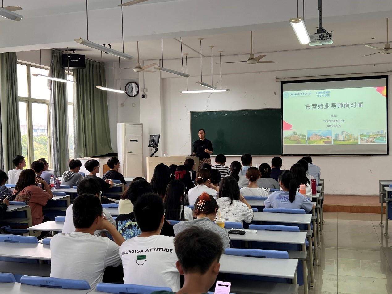 市场营销系针对2022级工商大类5班新生举行《市营始业导师面对面》的“教学研讨沙龙”活动,旨在发挥专业教师在大一、大二新生,生活适应指导、学习适应指导、学科专业知识入门及专业认同等方面的引导作用,构建新型师生关系,开启学生健全人格、热爱学习、追求卓越的大学学习生活之门。市场营销系为此安排了郭军灵、王建国、高键、冯娟、项丽瑶、雷雪、丁军、邓年奇、范晓明九位专业教师担任第一批始业导师。活动由市场营销系主任陈颖老师主持。