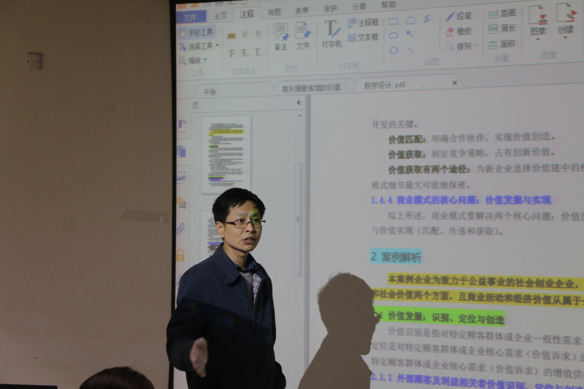 许胜江老师以南关厢素食馆为例讲解了社会企业的商业模式,重点阐述“焕新家园”和“纸因有你”两个项目来剖析案例成功的原因。现场嘉宾与许老师就案例的闪光点和待改进之处进行了激烈的讨论,进一步探究案例的价值,引发了在场学生的思考。