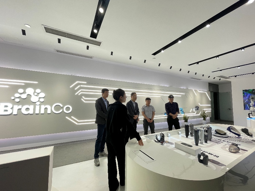 作为杭州人工智能小镇标杆企业之一,强脑科技在脑机接口与人工智能融合创新领域持续领跑。在强脑科技杨总的陪同下,调研组深入企业展厅与研发中心,重点考察了脑机接口智能仿生手、脑神经反馈训练系统、人工智能教育解决方案等核心技术成果。