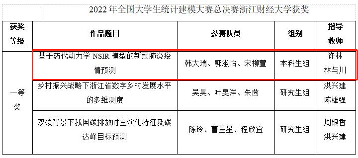 学生韩大瑞团队荣获本科生组全国一等奖,指导老师林与川老师获优秀指导教师奖。全国大学生统计建模大赛由中国统计教育学会、教育部高等学校统计学类专业教学指导委员会、全国应用统计专业学位研究生教育指导委员会联合举办,是全国影响最大的统计学科两大竞赛之一。