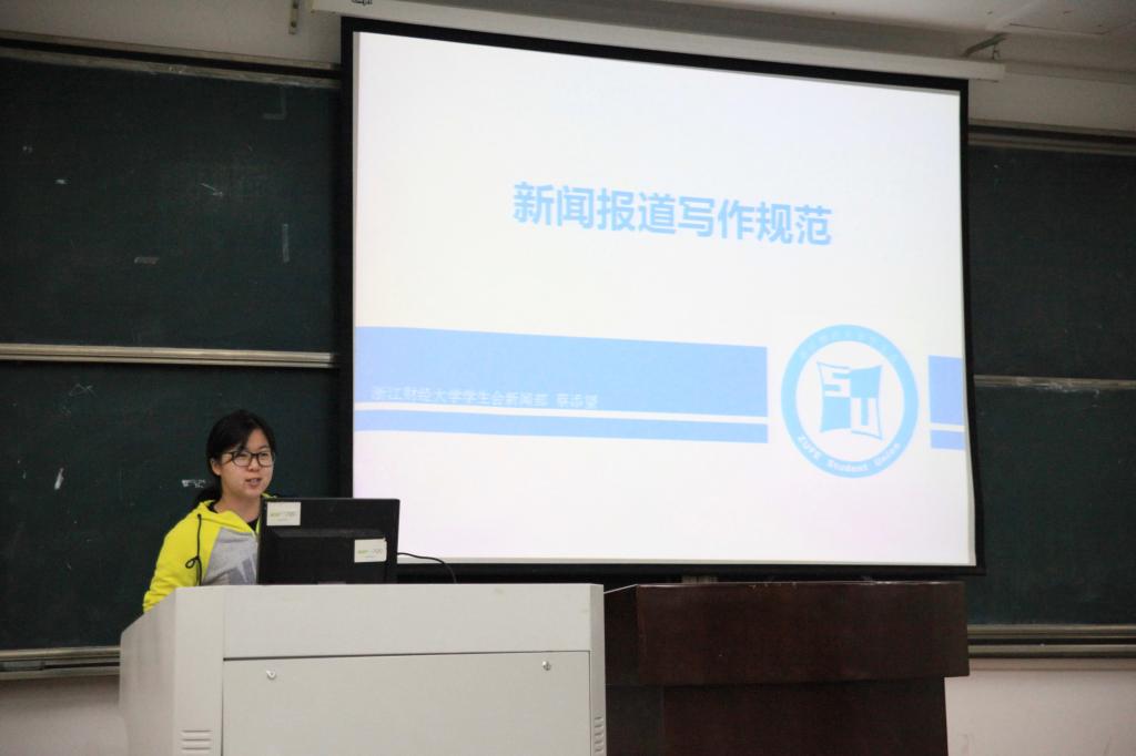 紧接着校新闻部部长蔡添望为干事们讲解了新闻报道写作规范和摄影技巧。唯有版面样式清爽大方又有吸引力的宣传海报才能更好地展现工商之魅力,唯有格式严谨思路清晰的文稿才能体现商学之严谨。