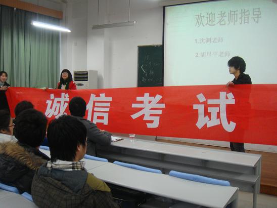 之后,09工商班的同学们在“诚信考试”的横幅上郑重地签下了自己的名字,同时也意味着签下了一种郑重的承诺。