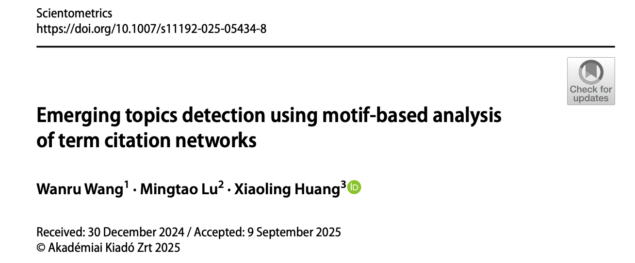 数智决策研究中心王婉茹老师、我校图书馆黄小玲老师合作完成的论文“Emerging topics detection using motif-based analysis of term citation networks”在国际期刊Scientometrics在线发表。Scientometrics是一本专注于信息计量学与科学计量学的国际学术期刊,2025年影响因子为3.5,属于信息资源管理领域JCR一区、FMS-B类期刊。该论文的工作受到了国家自然科学基金青年项目的支持。