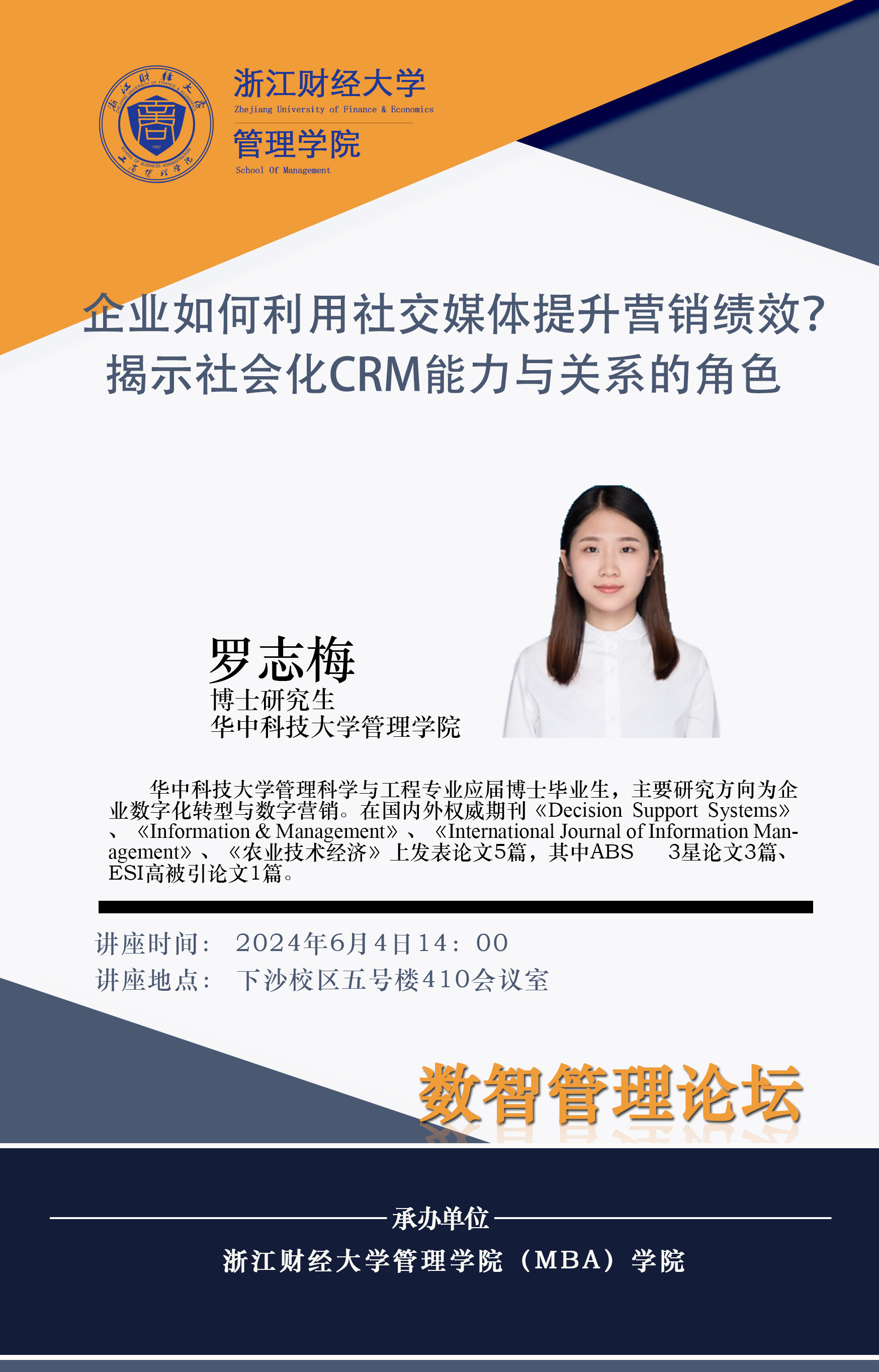 【讲座预告】罗志梅:企业如何利用社交媒体提升营销绩效?揭示社会化CRM能力与关系的角色