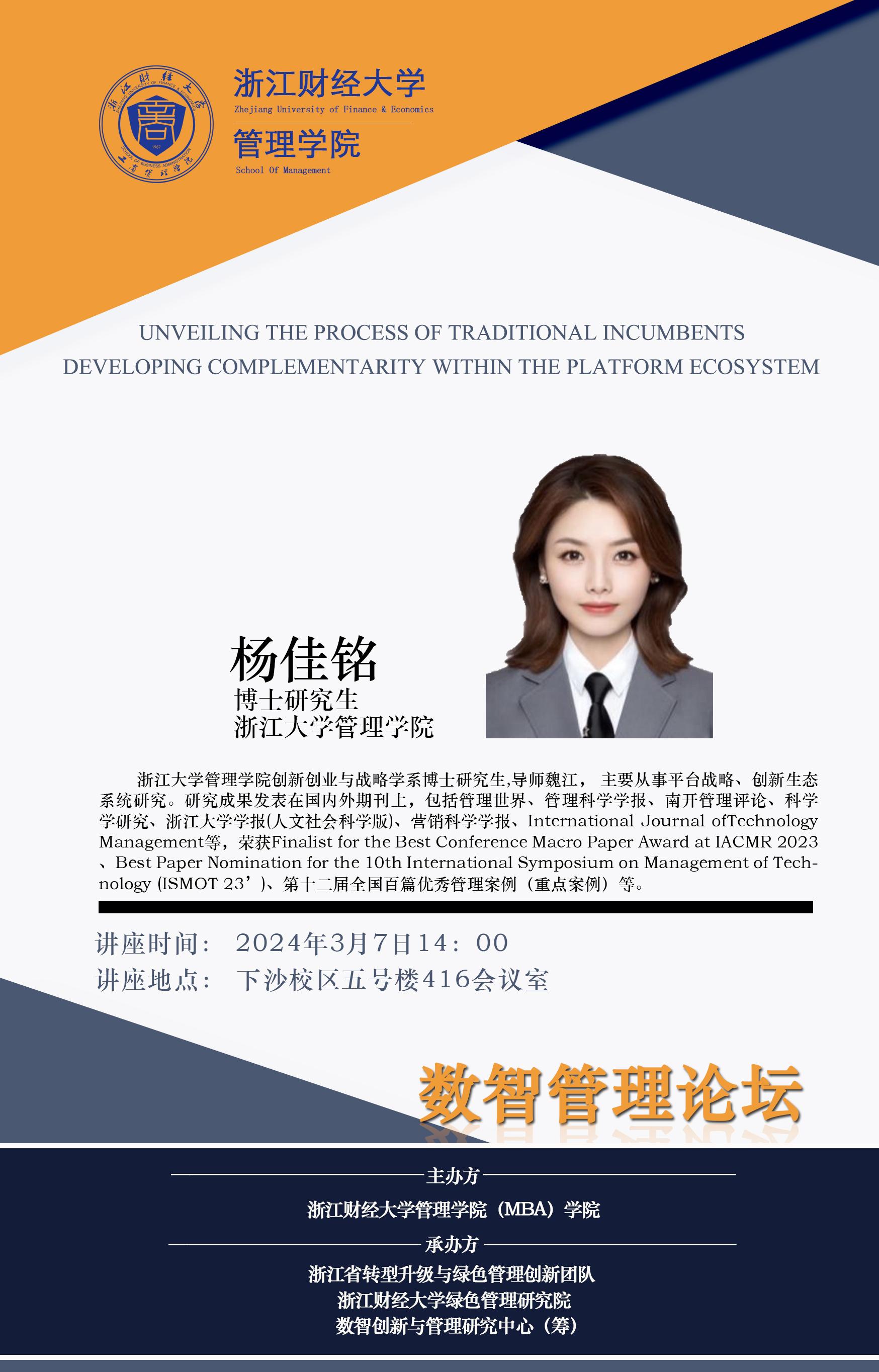 【院级研究中心讲座预告】杨佳铭:Unveiling the process of traditional incumbents developing complementarity within the platform ecosystem