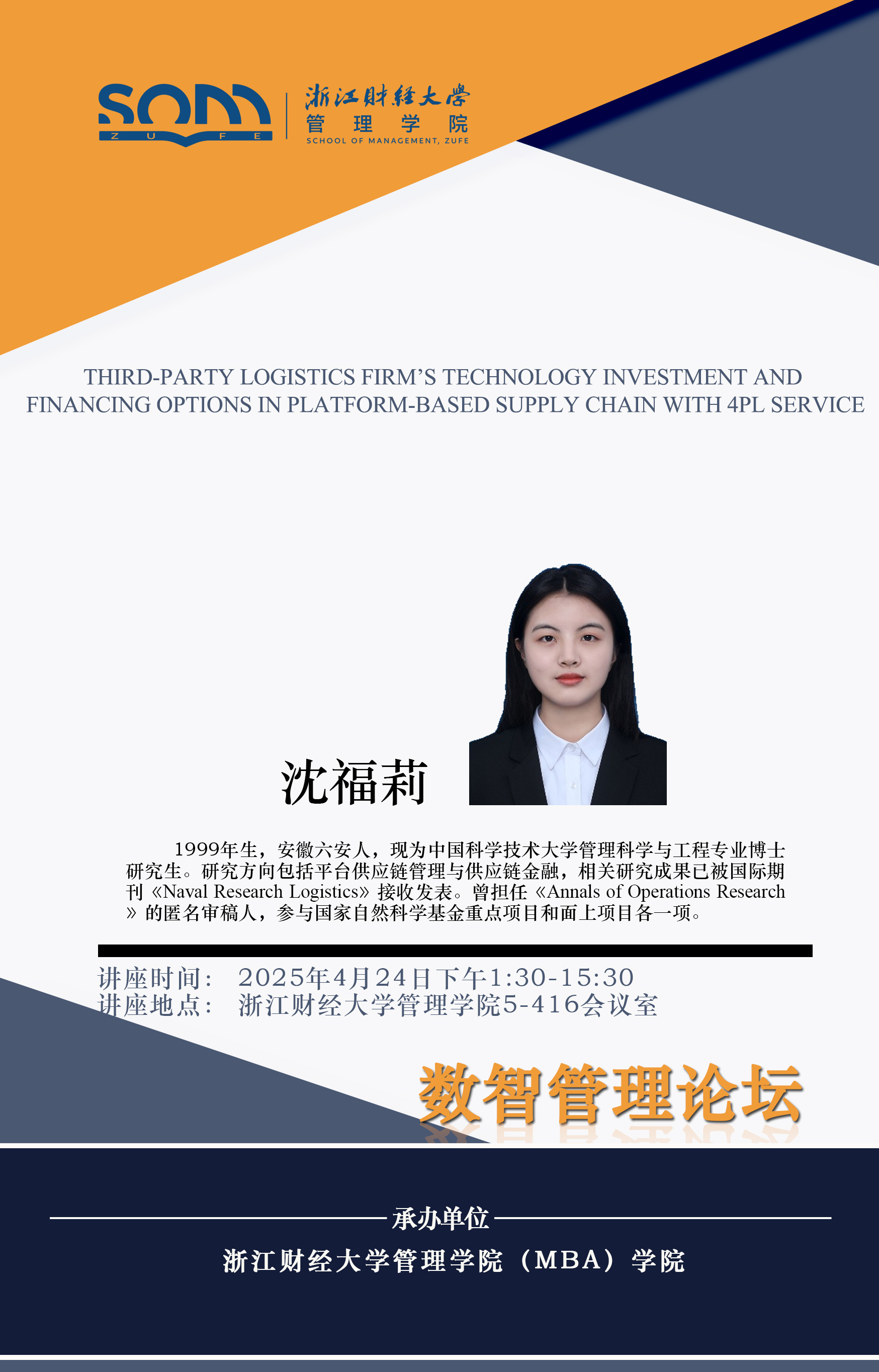 嘟嘟成人网 新财经战略系列学术活动2025年第17期【学术报告】沈福莉:Third-party logistics firm’s technology investment and financing options in platform-based supply chain with 4PL service (第三方物流企业技术投入和融资策略研究)
