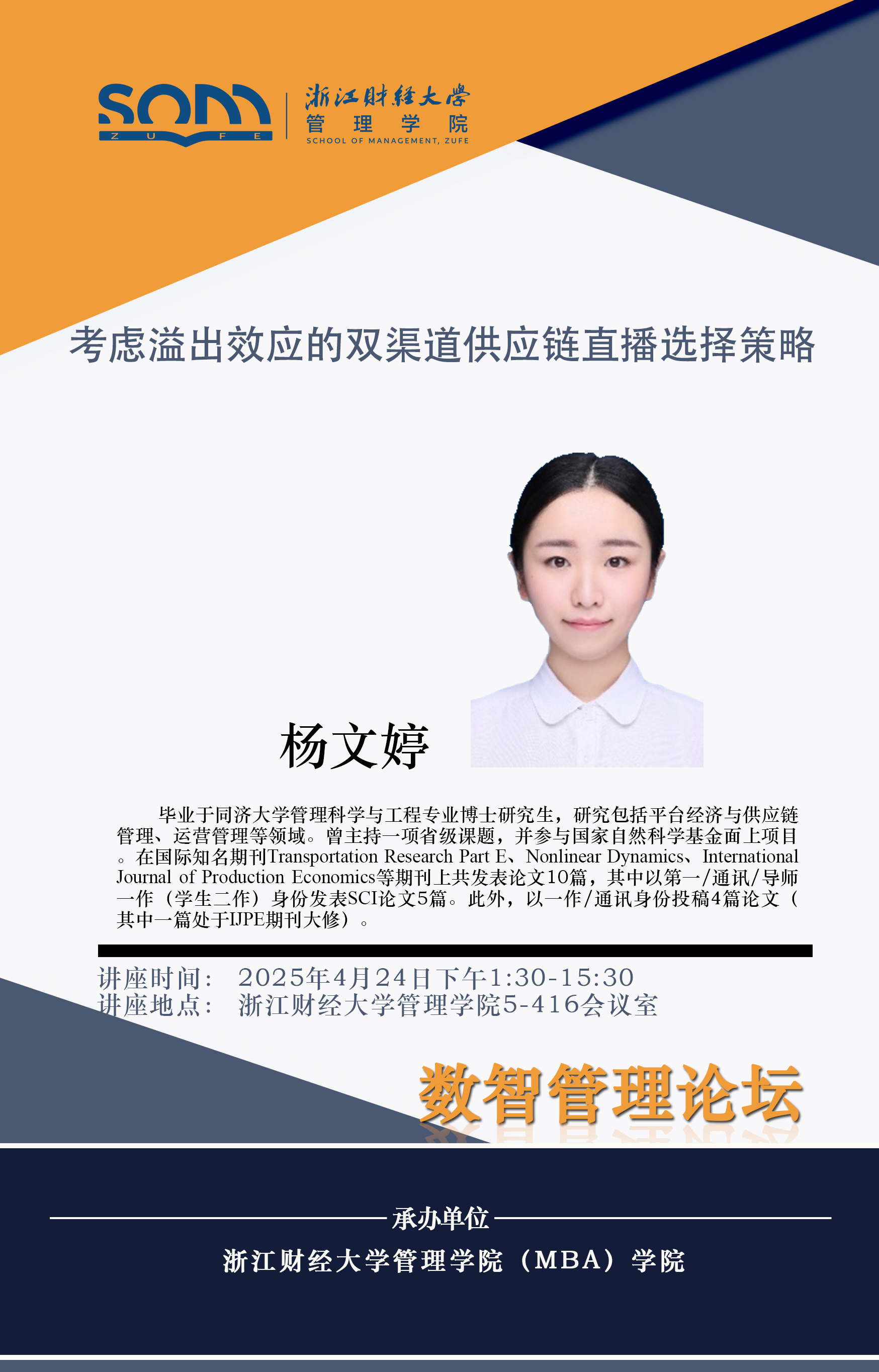 嘟嘟成人网 新财经战略系列学术活动2025年第20期【学术报告】杨文婷:考虑溢出效应的双渠道供应链直播选择策略
